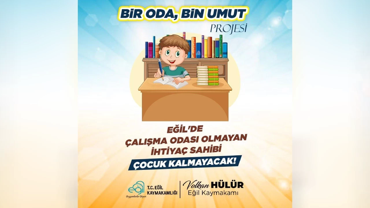Diyarbakır ili Eğil ilçesinde ihtiyaç sahibi çocuklara çalışma odası sağlamayı hedefleyen “Bir Oda Bin Umut” projesi başlatıldı. Eğil ilçe Kaymakamı Volkan Hülür, tüm Türkiye’ye örnek olacak bu projeyi duyurdu.
