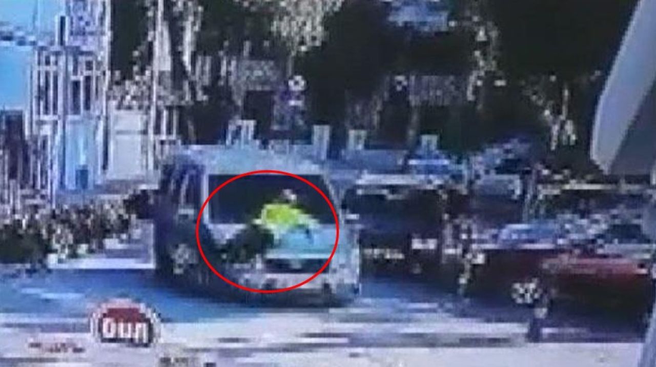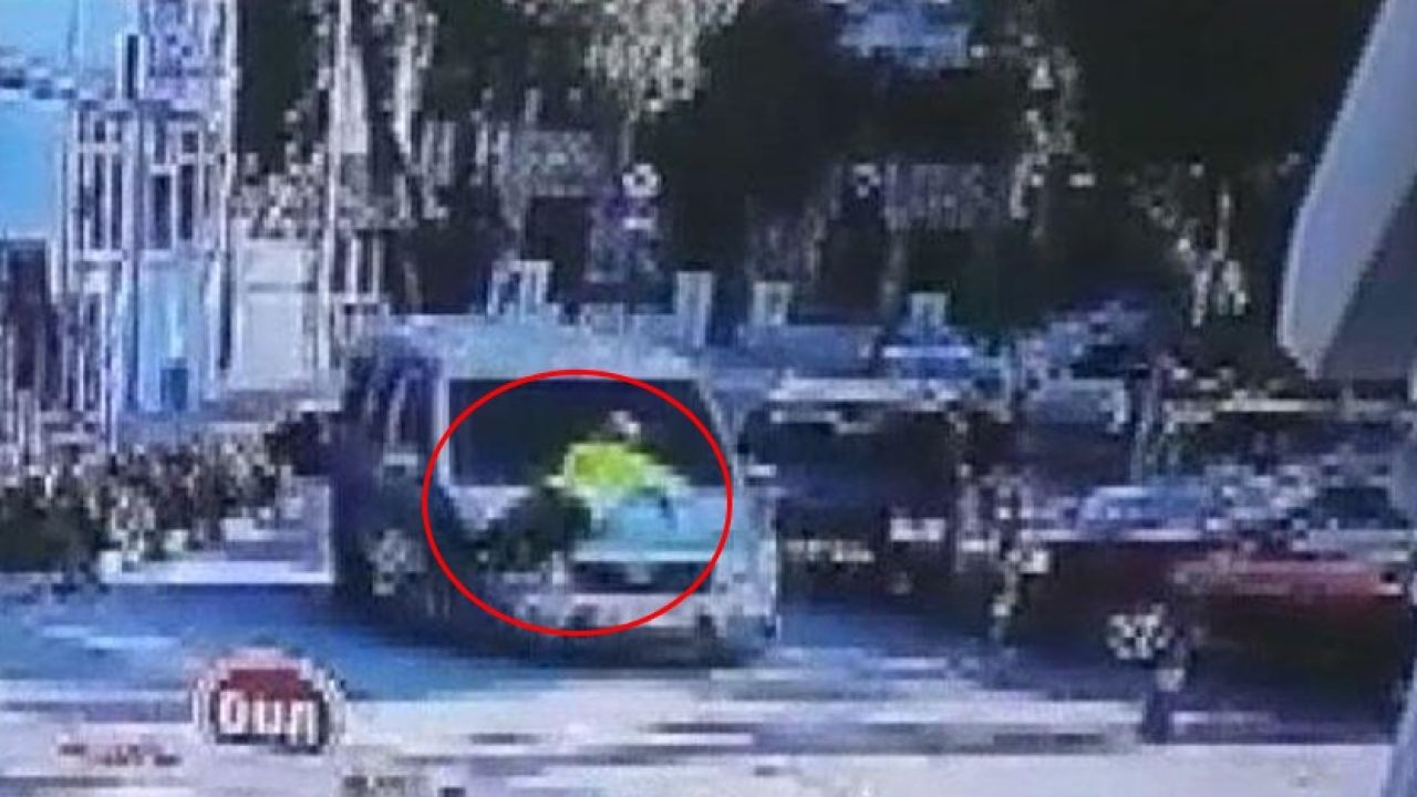 Ünal Karataş 'Dur' ihtarına uymayarak yoluna devam etmek isteyince olay yerinde bulunan trafik polisi Muzaffer Ertürk, aracın ön kaputuna atlayarak aracı durdurmaya çalıştı.
