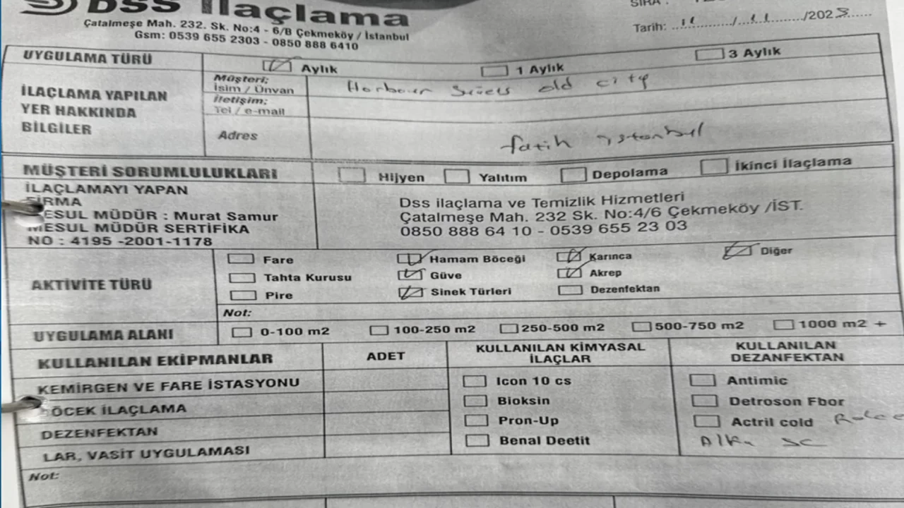 Otelde yapılan ilaçlama işlemine ait belge ortaya çıktı. 11 Kasım'da düzenlenen belgede, uygulamanın aylık olarak hamam böceği, güve, sinek türleri, karınca ve akrepten korunmak için yapıldığı görüldü.