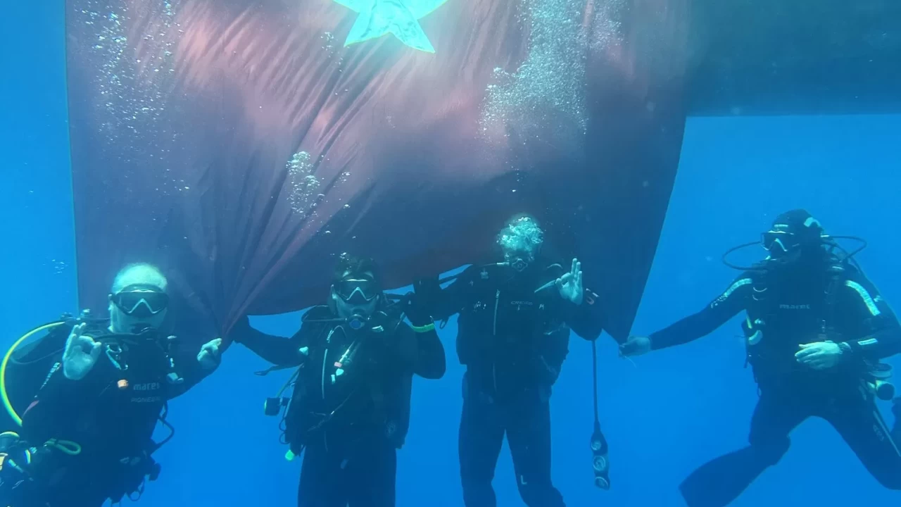 Etkinliğe katılanlar, bir ucu teknede bağlı Türk bayrağını su altında açarak, bir süre önünde yüzdü, fotoğraf çektirdi.