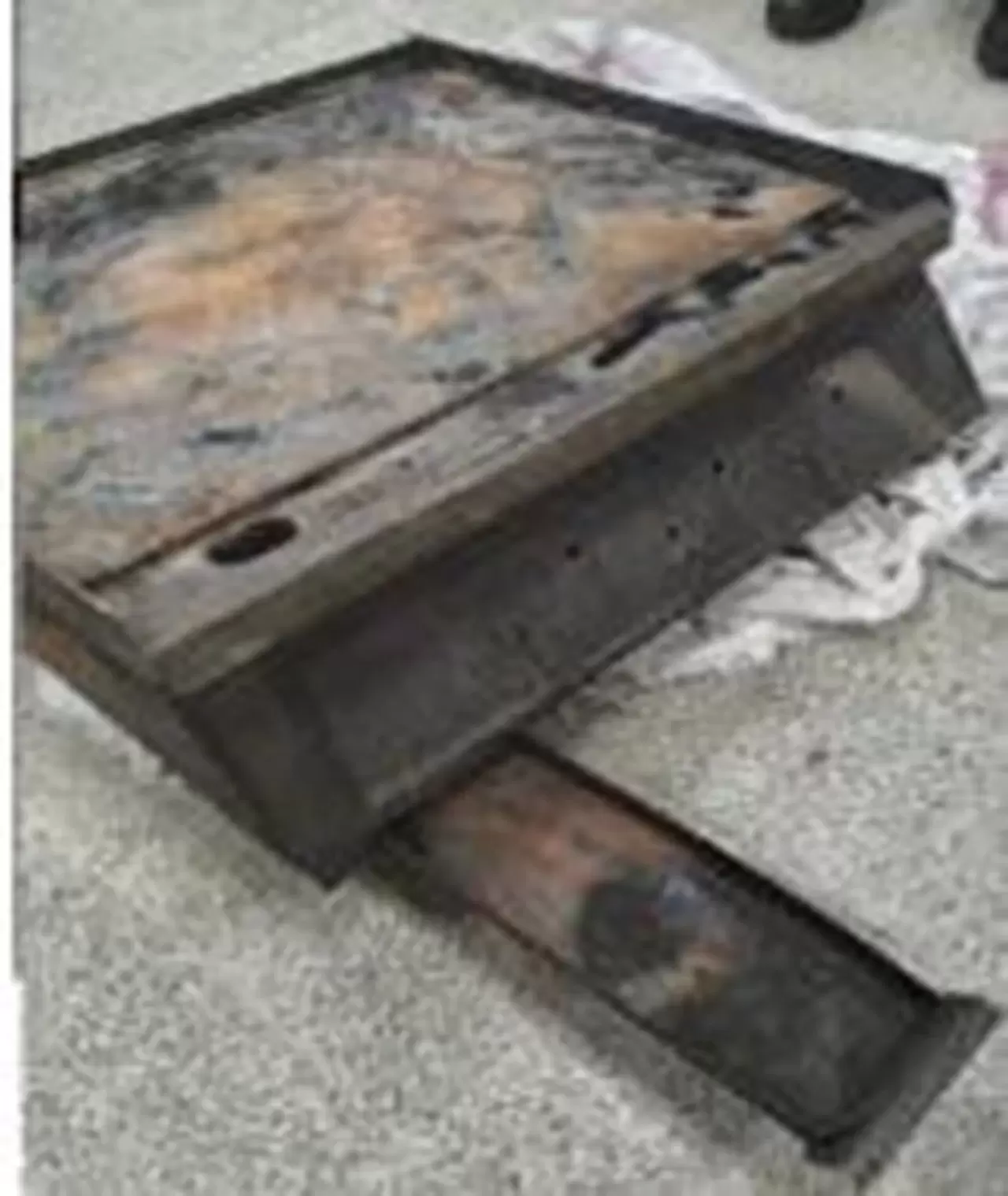 "Grill sehpası içinde bulunan ve D9 isimli solvent içeren endüstriyel yağlı yüzey temizleme malzemesi, toplama kabından yanarak akan yağlardan dolayı erimiştir.