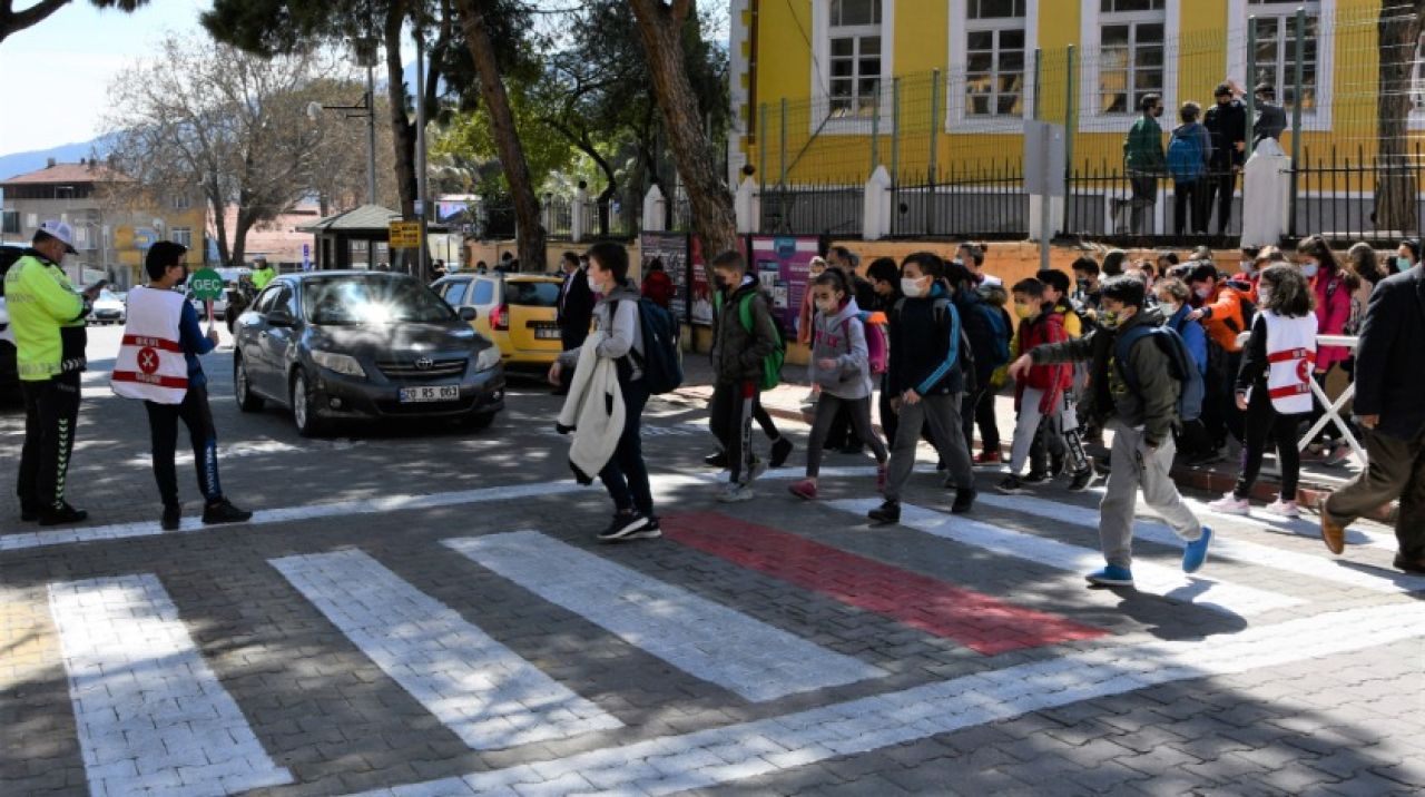 Öğrencilerin öğle arası çıkış saatinde gerçekleştirilen etkinlikte, İlçe Trafik Büro Amiri Kıdemli Başçavuş Burhan Aka, öğrencilere yaya geçidi ve trafik işaretleri ile ilgili kısa bilgi verdi.