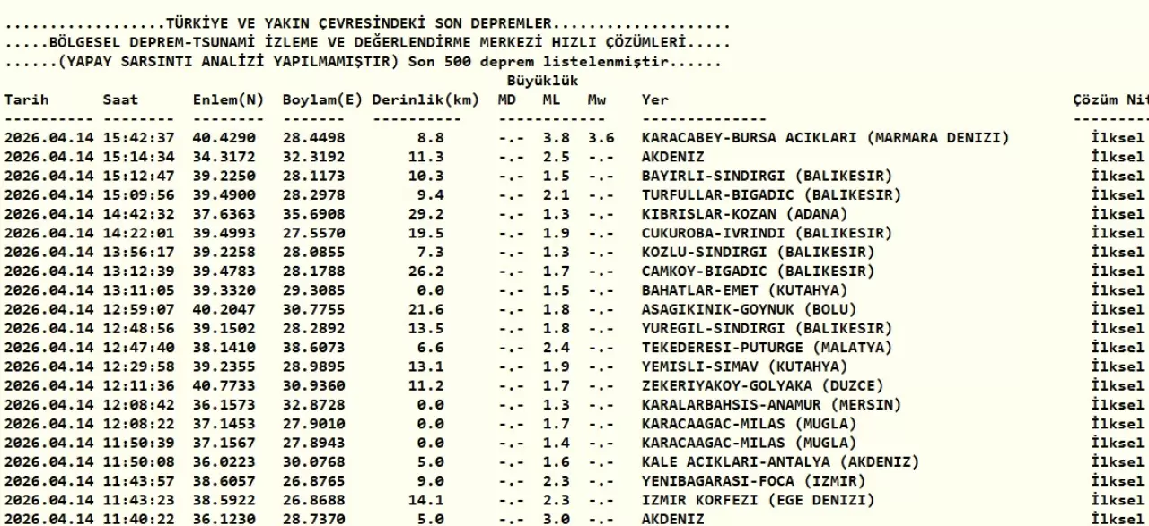 Kandilli Rasathanesi Son Depremler Listesi (14 Nisan 2026)