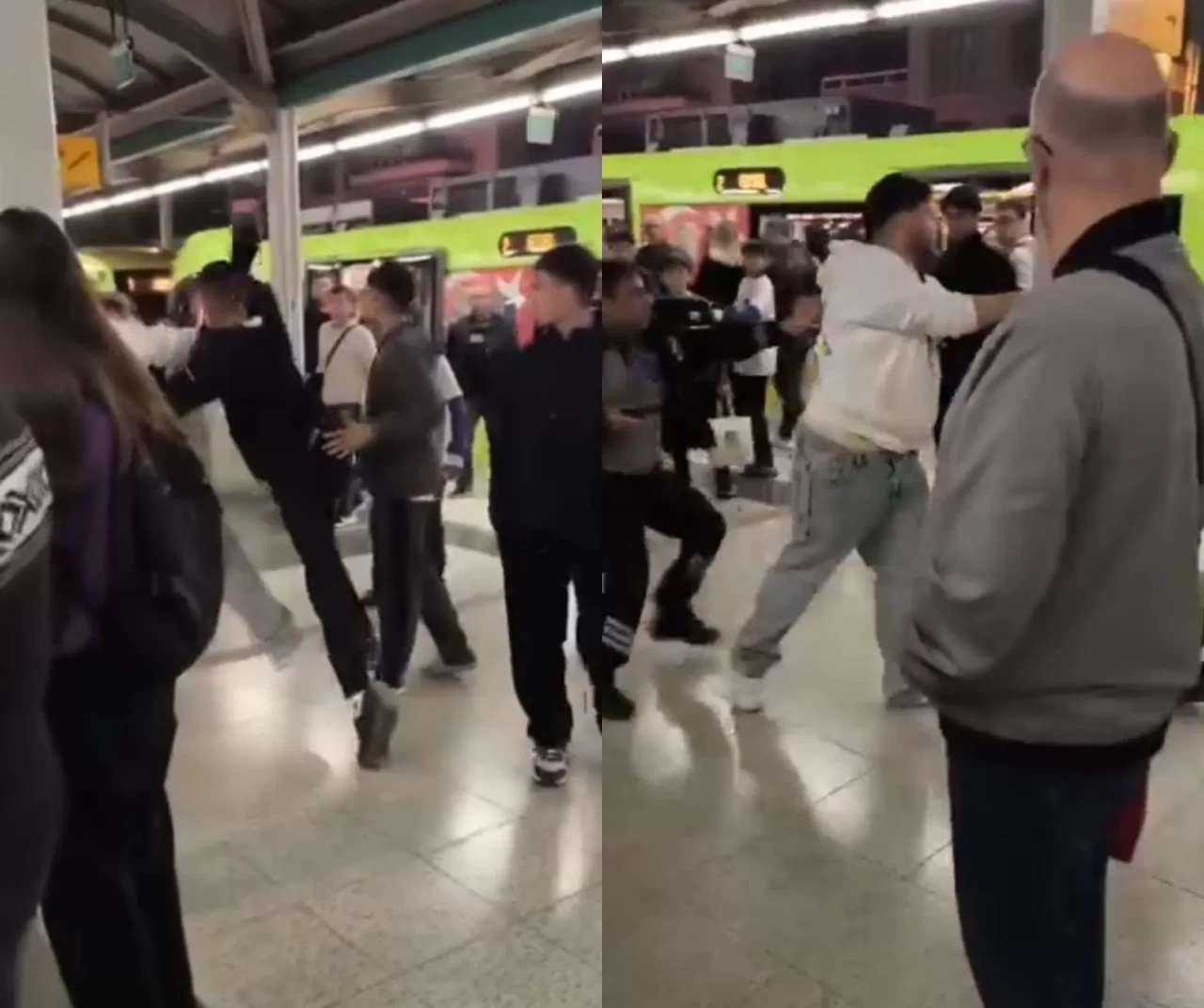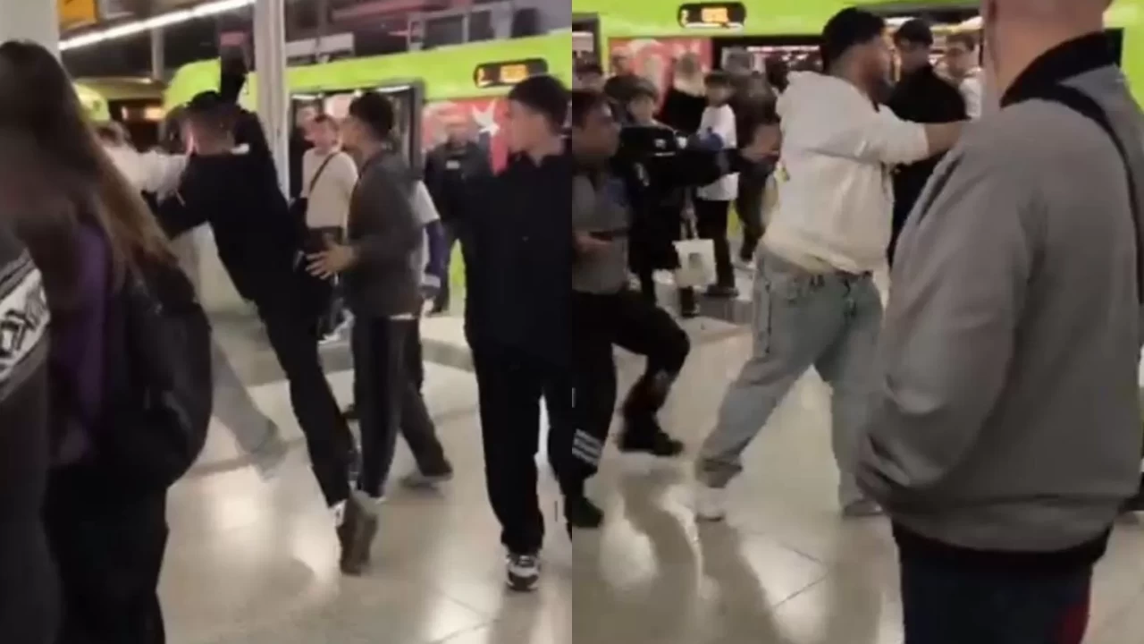 Tartışmanın kısa sürede büyümesiyle güvenlik görevlisi jopla müdahale etti. Bu sırada genç, güvenlik görevlisine yumruk atarak karşılık verdi. Arbede sırasında dubalar devrildi, istasyonda kısa süreli panik yaşandı.
