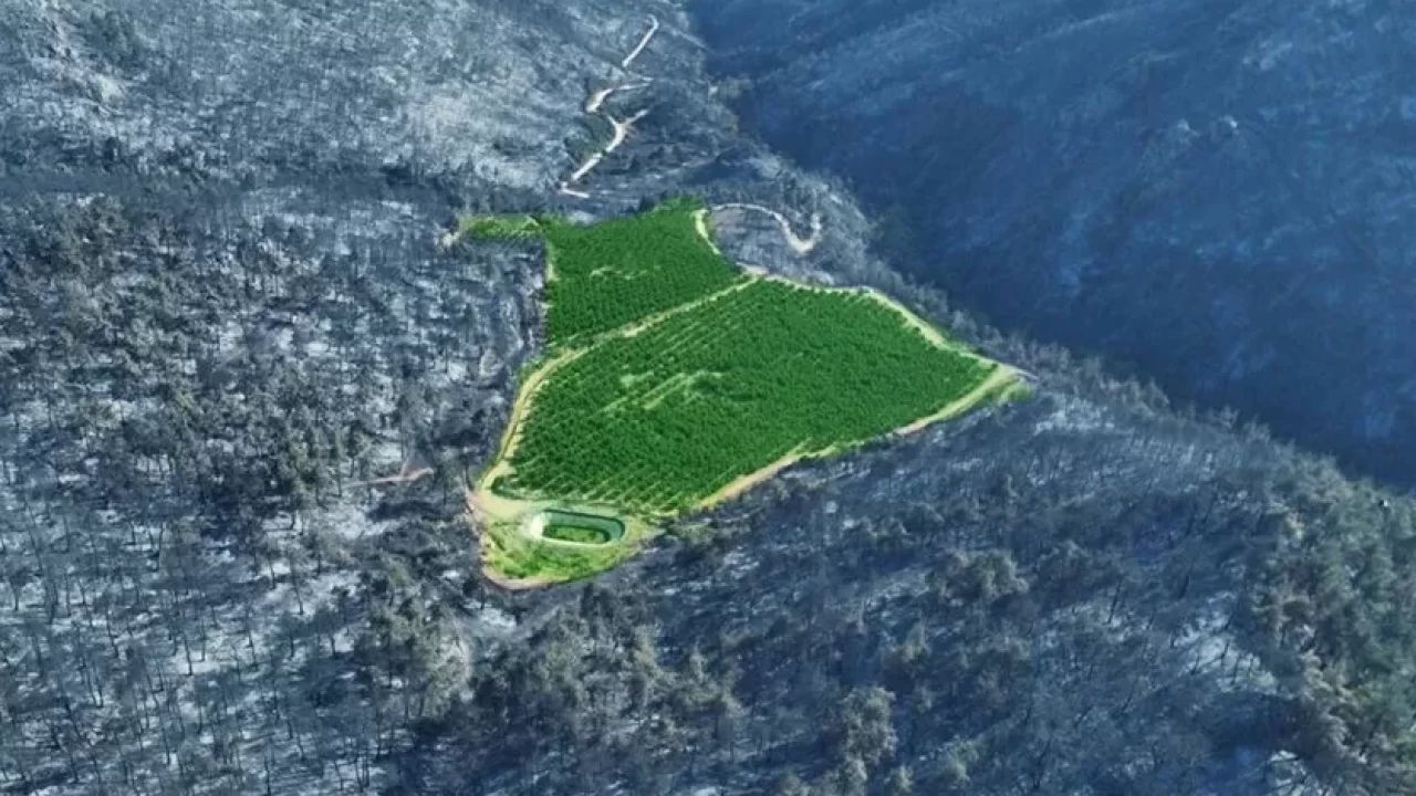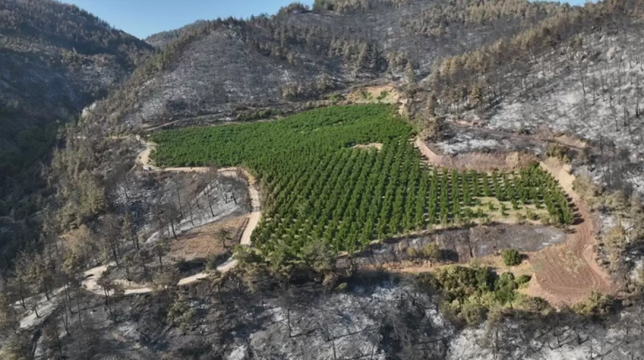 100 hektarlık ormanlık alandaki ağaçların hepsi küle dönerken, ormanın içinde Karahıdır Mahallesinde kalan nektarin bahçesi yemyeşil üzerinde meyveleriyle kala kaldı.