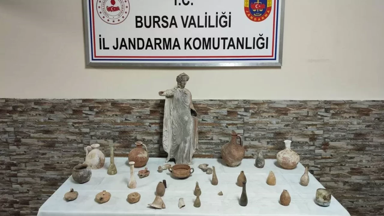 Bursa’nın Nilüfer ilçesinde jandarma ekiplerinin düzenlediği operasyonda tarihi eser kaçakçılarına darbe vuruldu. Roma ve Bizans dönemine ait 29 obje, 60 santimetrelik bir heykel ve el dedektörü ele geçirildi.