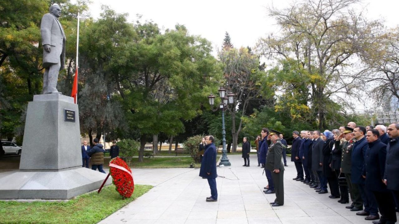 Yerel saatle 09.05'te saygı duruşuyla başlayan törende, İstiklal Marşı okundu ve Atatürk Anıtı'na çelenk bırakıldı.