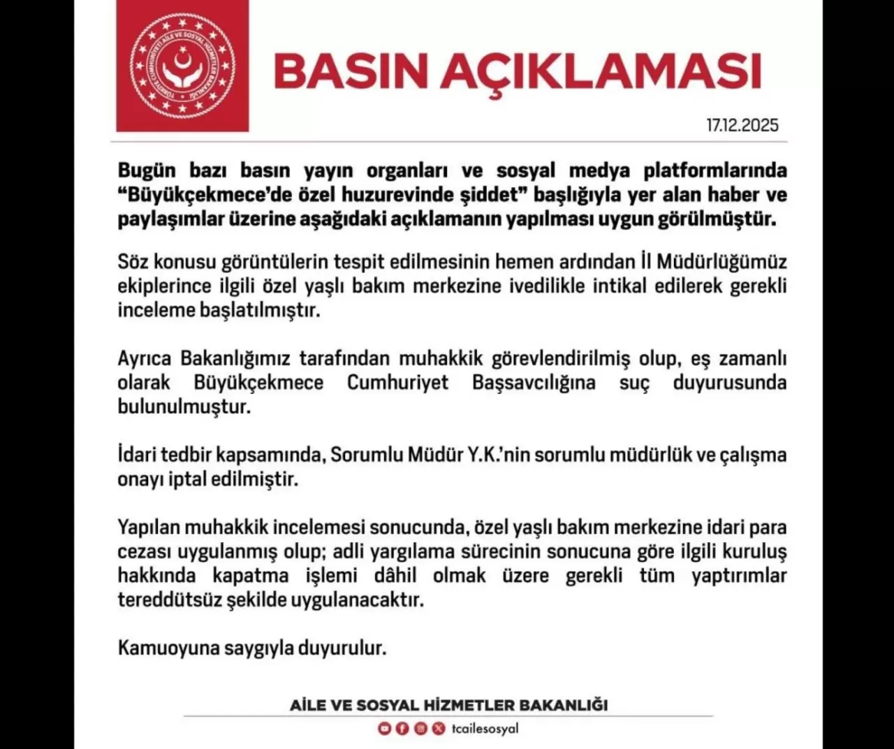 Aile ve Sosyal Hizmetler Bakanlığı, Büyükçekmece’de özel bir huzurevinde şiddet yaşandığı iddialarına ilişkin inceleme başlatıldığını açıkladı. Yapılan yazılı açıklamada, olayla ilgili sorumlu müdür Y.K.’nın sorumlu müdürlük ve çalışma onayının iptal edildiği bildirildi.