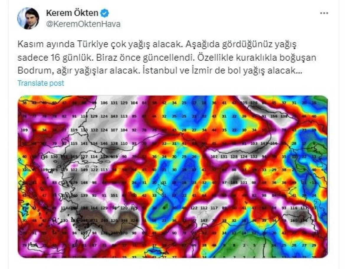 "Kasım ayında Türkiye çok yağış alacak. Aşağıda gördüğünüz yağış sadece 16 günlük. Biraz önce güncellendi. Özellikle kuraklıkla boğuşan Bodrum, ağır yağışlar alacak. İstanbul ve İzmir de bol yağış alacak..."