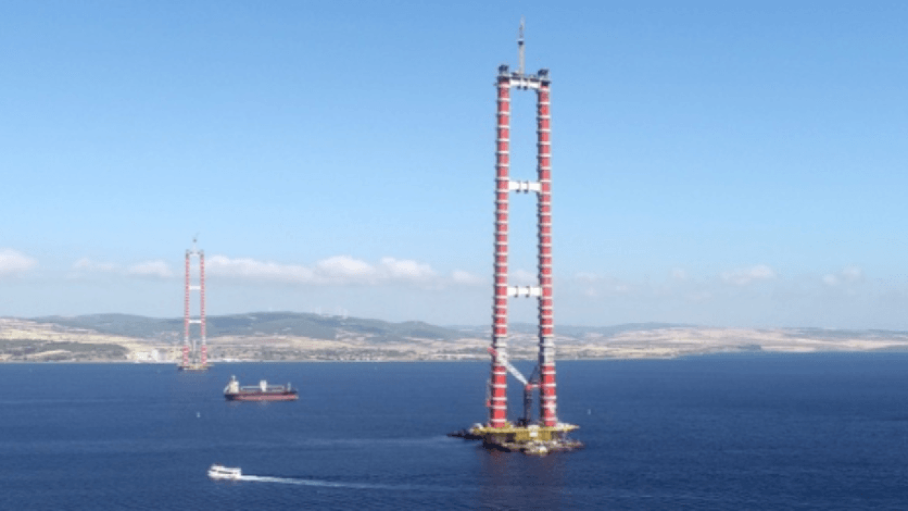"Çanakkale Boğazı'nın gerdanlığı" olarak nitelendirilen köprüde, her iki yakada suyun içindeki blokların üst üste yerleştirilmesiyle hazırlanan ve Türk bayrağını simgeleyen kırmızı beyaz renklere sahip ayakların tamamlanmasıyla diğer çalışmalara ağırlık veriliyor.