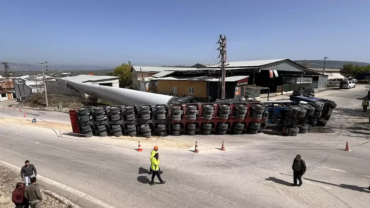 İlçeye bağlı Umurbey beldesinde rüzgar türbini pervanesi taşıyan ve sürücüsü öğrenilemeyen tır, manevra esnasında devrildi.