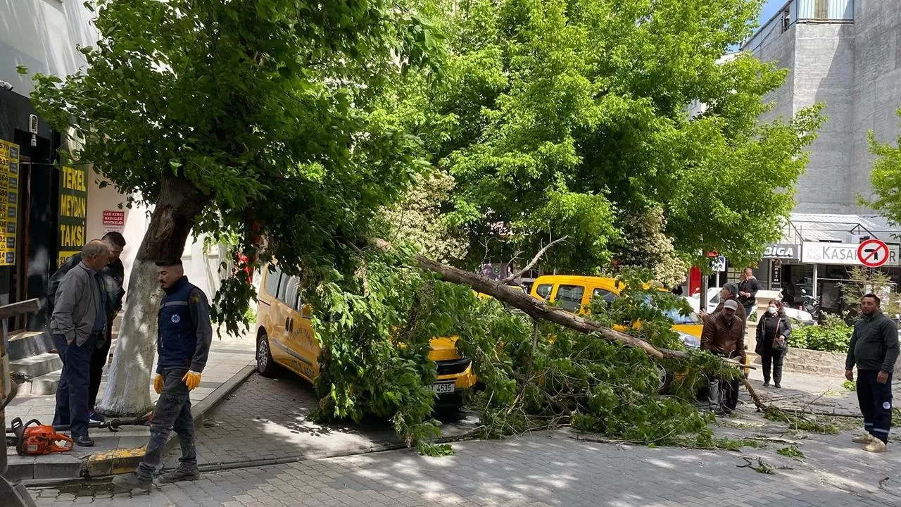 İlçedeki Sakarya Mahallesi Tekel Meydanı'nda bulunan bir ağaç, kuvvetli rüzgarın etkisiyle taksi durağında park halinde bulunan araçların üzerine devrildi.