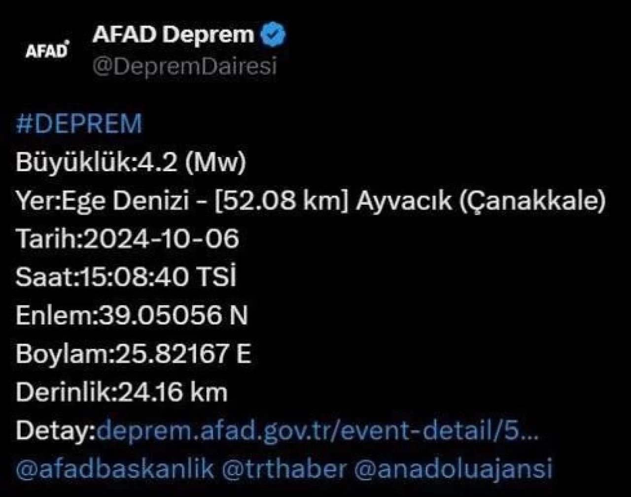 Ege Denizi'nden saat 15.08 sıralarında 4.2 büyüklüğünde deprem meydana geldi. Çanakkale'nin Ayvacık ilçesi açıklarındaki depremin derinliği 24.16 km olarak açıklandı.