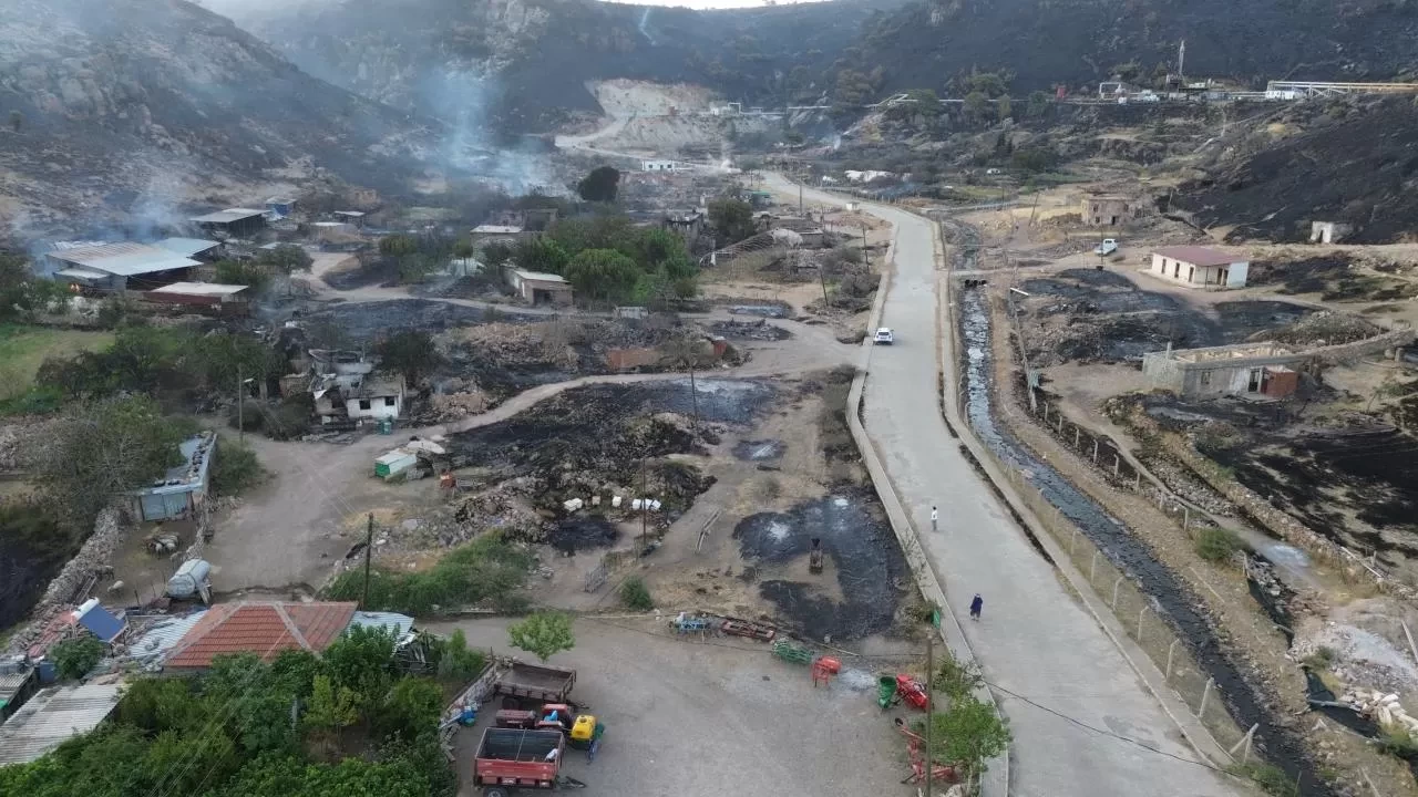 Öte yandan, yangından etkilenen ve içinde jeotermal santral ile tarihi Hüdavendigar Cami'nin bulunduğu Tuzla köyü dron ile havadan görüntülendi.