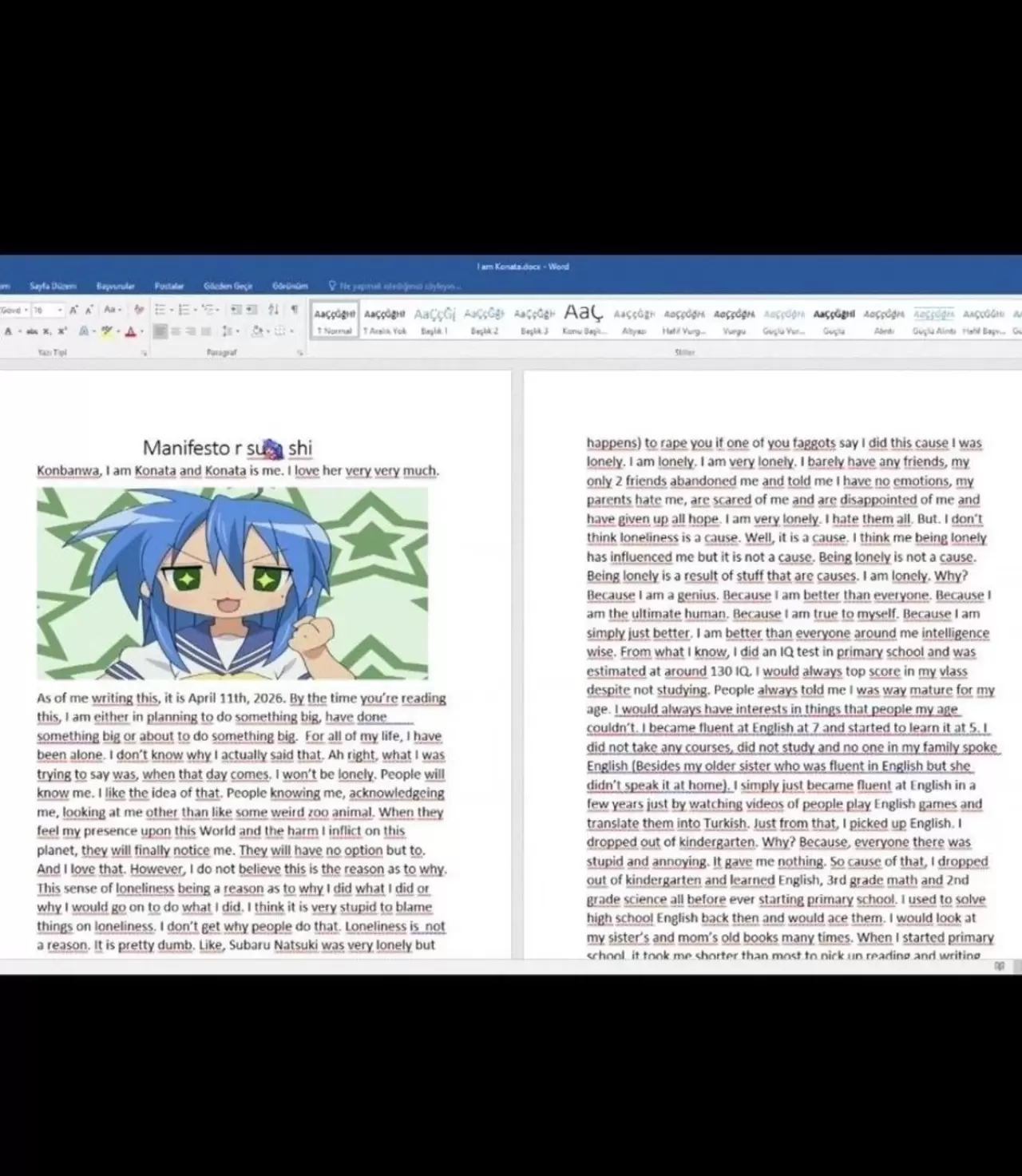 "Bunu yazarken tarih 11 Nisan 2026. Sen bunu okuduğunda ya bir şey planlıyor olacağım, yapmış olacağım ya da yapmak üzere olacağım. Hayatım boyunca hep yalnız kaldım. Nedenini bilmiyorum, aslında çok fazla şeyim vardı. Hep insanlarla kaynaşmaya çalıştım ama yalnız kaldım. İnsanların beni tanıması, fark etmesi hoşuma gidiyor. Bu dünyadaki varlığımı ve verdiğim zararı hissetsinler istiyorum ki sonunda beni fark etsinler. Bunun nasıl olacağını bilmiyorum ama yapacağım. Ancak yalnızlık yaptığım şeyin sebebi değil. Yapmak istesem de yalnızlık yüzünden suçlayamam. İnsanlar bunu yapıyor ama bu doğru değil. Yalnızlık bir sebep değildir.