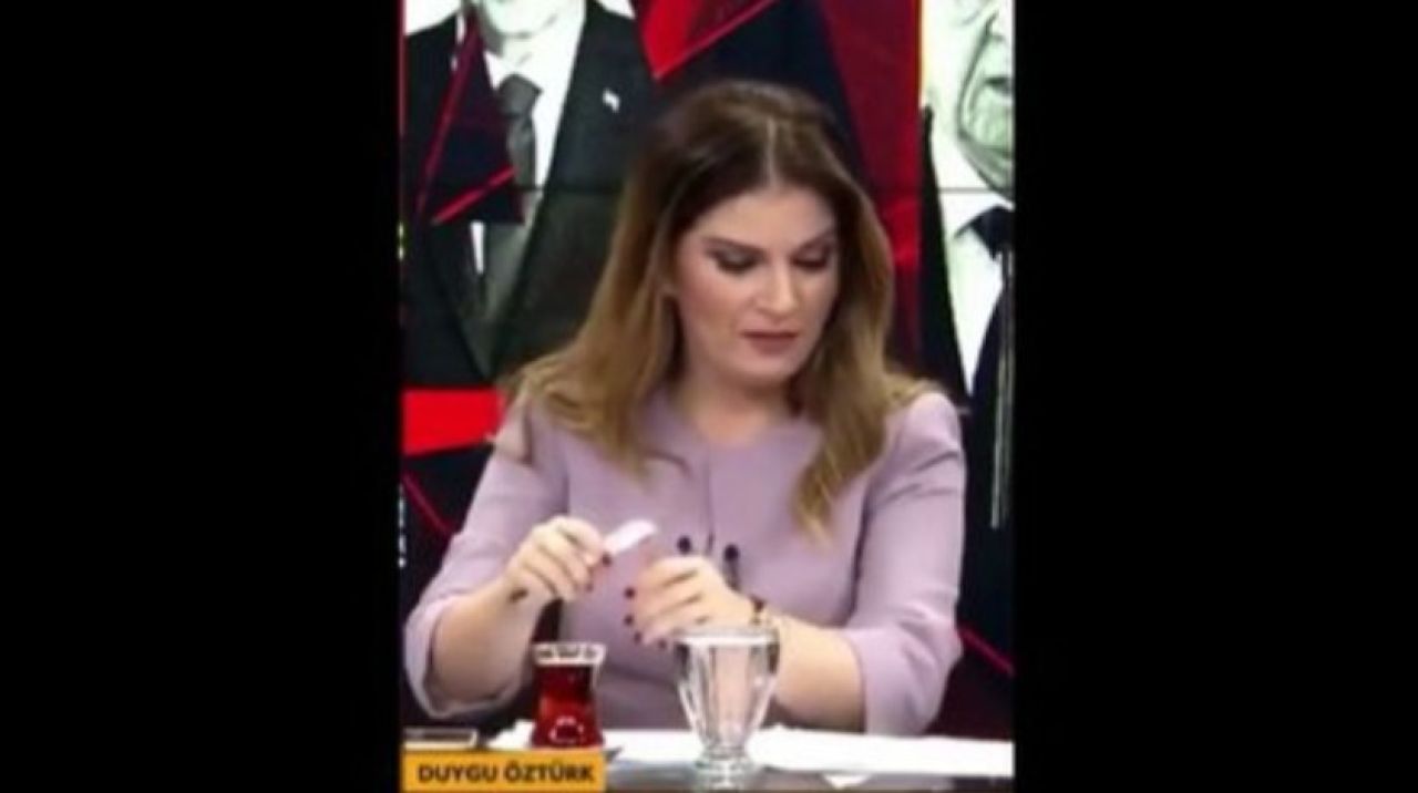 TVNET ekranlarında canlı yayın sırasında masa kırıldı. Masanın üzerinde bulunan çay ve su moderatörün üzerine fırladı.