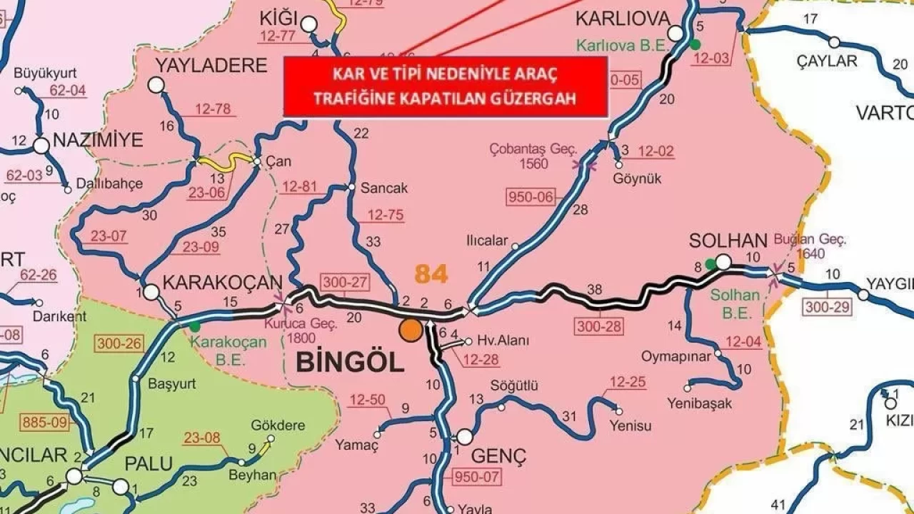 Bingöl Valisi Ahmet Hamdi Usta, sosyal medya hesabından yaptığı açıklamada, ‘'950-05 KK No'lu Bingöl Erzurum devlet yolunun Çatak-Yedisu yol ayrımının Erzurum istikametine 0-14 kilometreleri arası yoğun kar yağışı ve tipi nedeni ile saat 23.15 itibari ile araç trafiğine kapatılmıştır'' denildi.