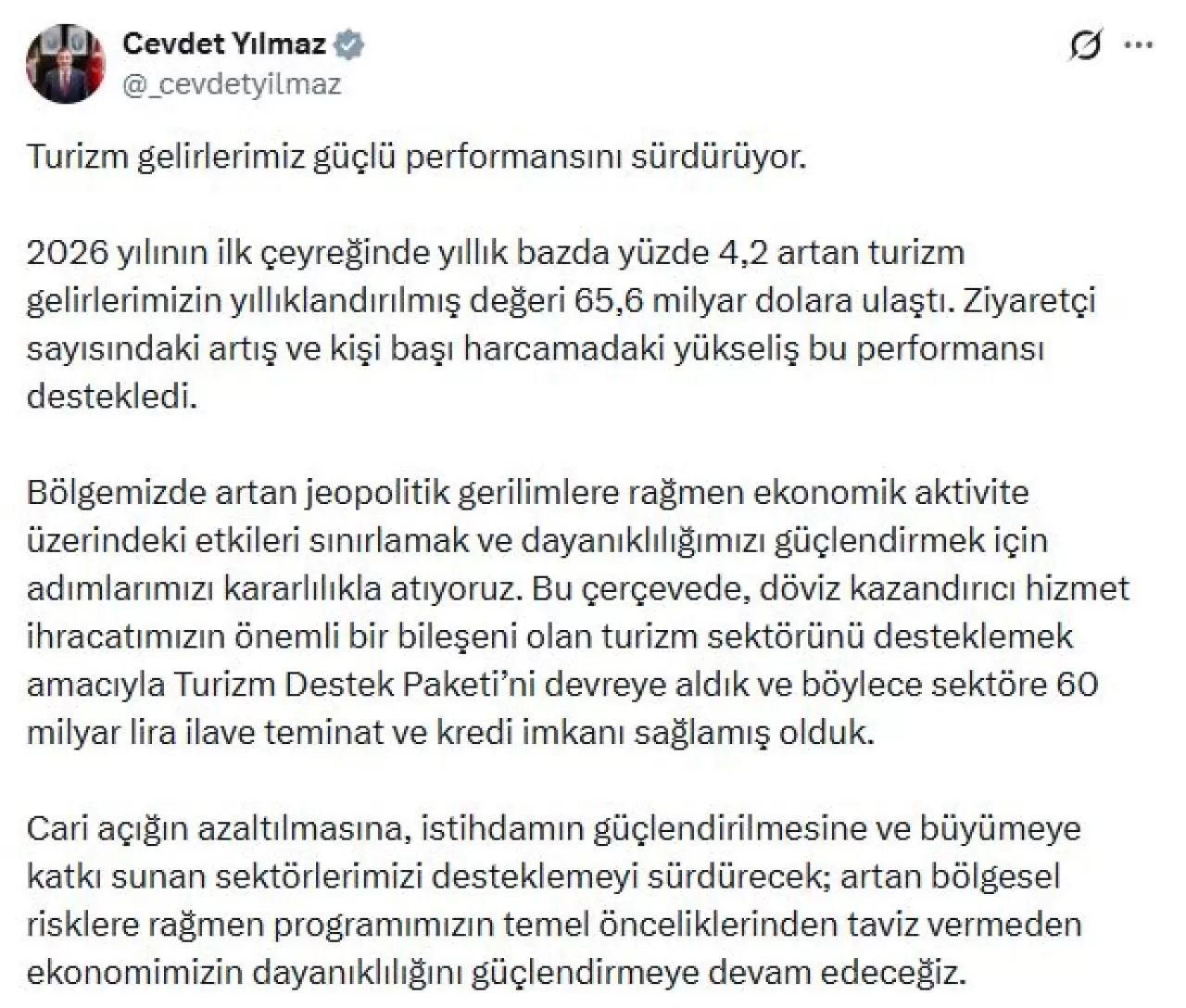 “Turizm gelirlerimiz güçlü performansını sürdürüyor. 2026 yılının ilk çeyreğinde yıllık bazda yüzde 4,2 artan turizm gelirlerimizin yıllıklandırılmış değeri 65,6 milyar dolara ulaştı. Ziyaretçi sayısındaki artış ve kişi başı harcamadaki yükseliş bu performansı destekledi. Bölgemizde artan jeopolitik gerilimlere rağmen ekonomik aktivite üzerindeki etkileri sınırlamak ve dayanıklılığımızı güçlendirmek için adımlarımızı kararlılıkla atıyoruz. Bu çerçevede, döviz kazandırıcı hizmet ihracatımızın önemli bir bileşeni olan turizm sektörünü desteklemek amacıyla Turizm Destek Paketi’ni devreye aldık ve böylece sektöre 60 milyar lira ilave teminat ve kredi imkanı sağlamış olduk. Cari açığın azaltılmasına, istihdamın güçlendirilmesine ve büyümeye katkı sunan sektörlerimizi desteklemeyi sürdürecek, artan bölgesel risklere rağmen programımızın temel önceliklerinden taviz vermeden ekonomimizin dayanıklılığını güçlendirmeye devam edeceğiz”