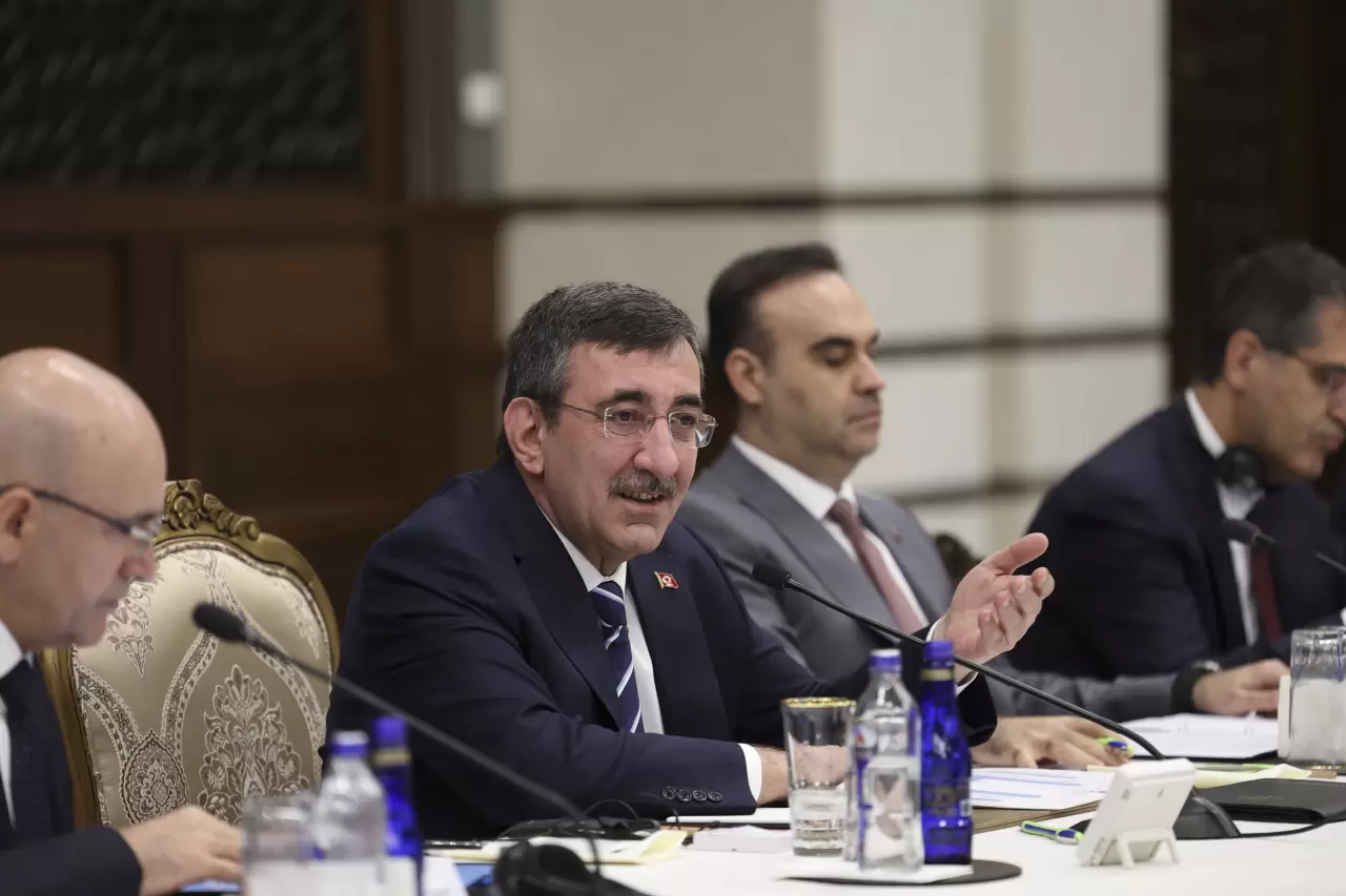 Cevdet Yılmaz, Cumhurbaşkanlığı Külliyesi'nde düzenlenen "Türkiye Yüzyılı Yatırım İçin Güçlü Merkez" basın toplantısına katıldı. Toplantıda, Hazine ve Maliye Bakanı Mehmet Şimşek, Sanayi ve Teknoloji Bakanı Mehmet Fatih Kacır, Ticaret Bakanı Ömer Bolat, Cumhurbaşkanlığı Strateji ve Bütçe Başkanı İbrahim Şenel, Cumhurbaşkanlığı Yatırım ve Finans Ofisi Başkanı Ahmet Burak Dağlıoğlu da yer aldı.