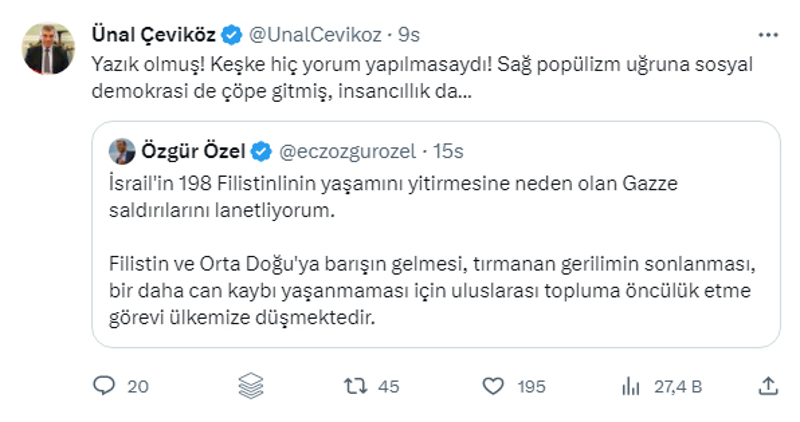 İsrail ile Filistin arasındaki kriz ile ilgili paylaşım yapan Özgür Özel'e, eski CHP İstanbul Milletvekili Ünal Çeviköz'den tepki geldi. Çeviköz, "Yazık olmuş! Keşke hiç yorum yapılmasaydı! Sağ popülizm uğruna sosyal demokrasi de çöpe gitmiş, insancıllık da..." ifadelerini kullandı.