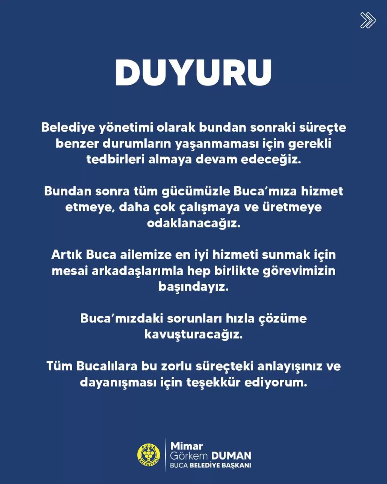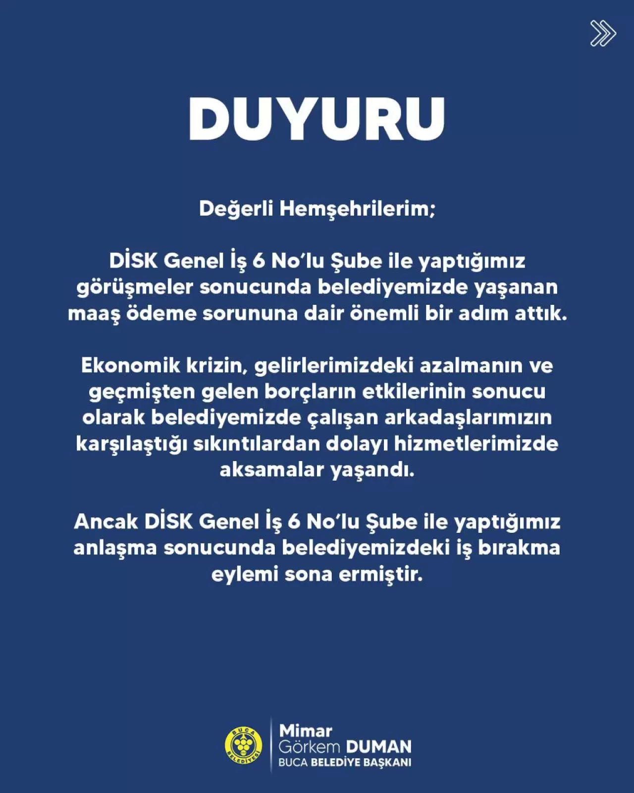 CHP'li Buca Belediyesi'ndeki işçiler, maaşlarını alamadıkları için başlattıkları iş bırakma eylemini sona erdirdi. Belediye ve sendika arasında yapılan anlaşmayla işçiler yeniden göreve dönerken, Başkan Duman gelecekte benzer sorunların yaşanmaması için önlemler alacaklarını açıkladı.