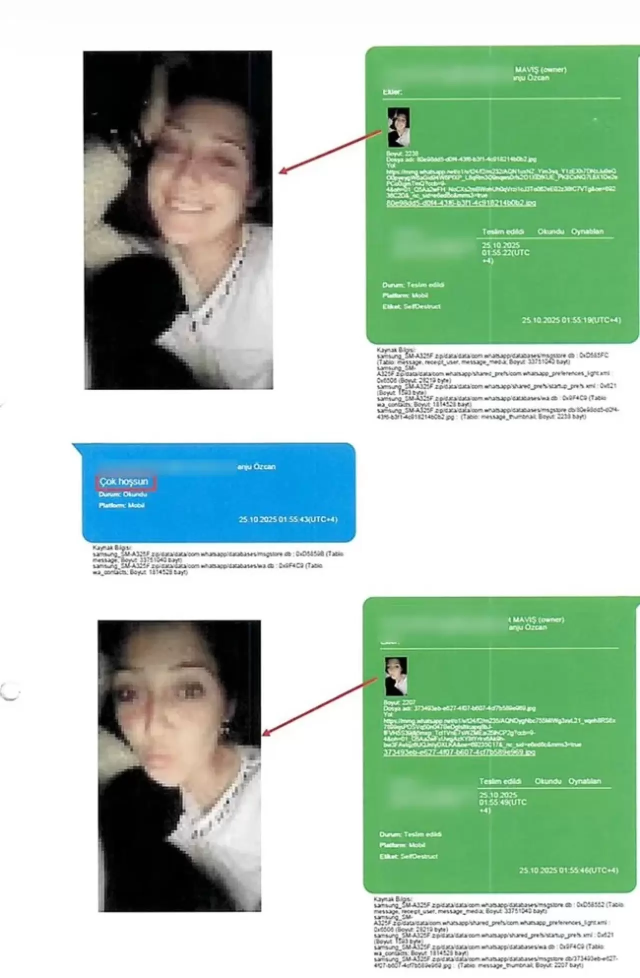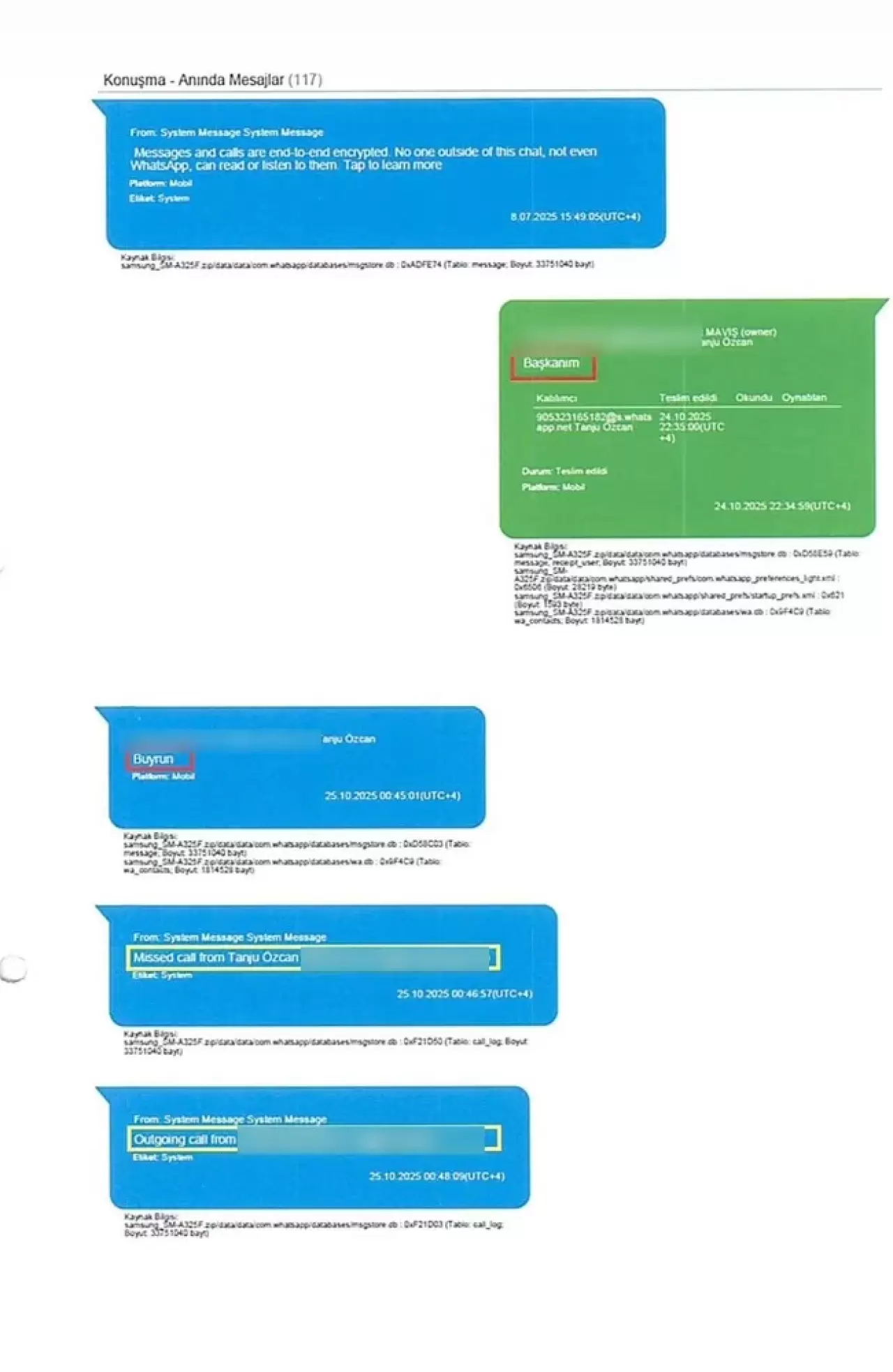 İddianamede Öznur Çağalı'nın telefonunda bulunan mesajlara da yer verildi. Buna göre, Çağalı ile Tanju Özcan'ın kullandığı belirtilen hat arasında WhatsApp üzerinden toplam 117 görüşme ve mesajlaşma olduğu öğrenildi. İddianamede bu yazışmaların bazı bölümleri de yer aldı.