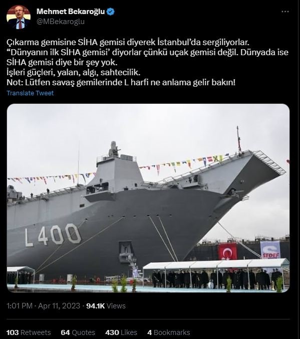 CHP İstanbul Milletvekili Mehmet Bekaroğlu, sosyal medya hesabından TCG Anadolu gemisini hedef aldı. Bekaroğlu, "Çıkarma gemisine SİHA gemisi diyerek İstanbul'da sergiliyorlar. "Dünyanın ilk SİHA gemisi' diyorlar çünkü uçak gemisi değil. Dünyada ise SİHA gemisi diye bir şey yok. İşleri güçleri, yalan, algı, sahtecilik. Not: Lütfen savaş gemilerinde L harfi ne anlama gelir bakın!" ifadelerini kullandı.
