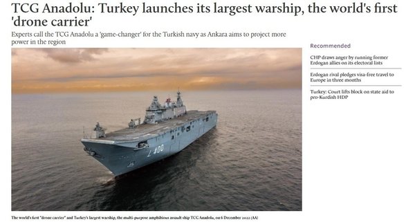 Dünyada savaş konseptini bile değiştiren SİHA'larla entegre şekilde hazırlanan ilk gemi olan TCG Anadolu ezberleri bozan özelliklere sahip. Bugün, TCG Anadolu ile ilgili gelişmeler dünya medyasında geniş şekilde yer aldı.