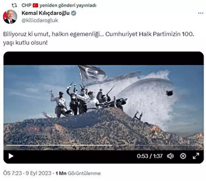 CHP Genel Başkanı Kemal Kılıçdaroğlu, partisinin 100. yılına özel hazırladığı bideo klibi sosyal medya hesabından paylaştı. Kılıçdaroğlu, paylaşımına, "Biliyoruz ki umut, halkın egemenliği... Cumhuriyet Halk Partimizin 100. yaşı kutlu olsun!" notunu düştü.
