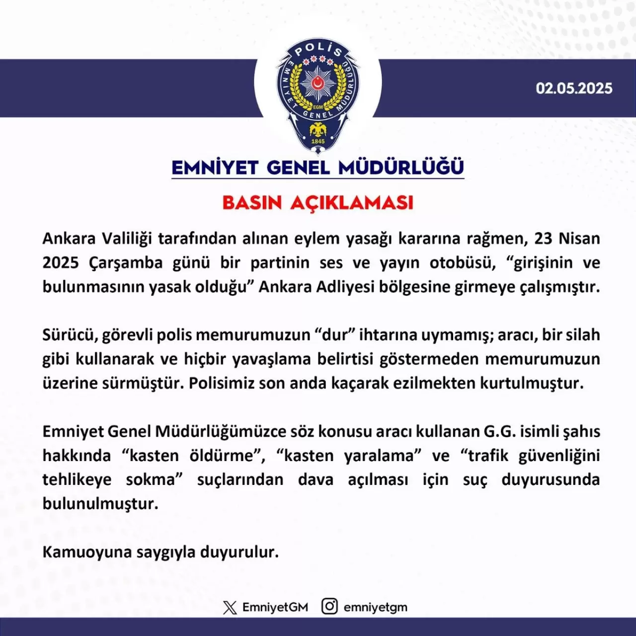 Ankara Valiliği tarafından alınmış eyleme seyirci kararna rağmen, 23 Nisan 2025 Çarşamba günü bir partinin ses ve yayın otobüsü, “girişin ve bulunmasının yasak olduğu” Ankara Adliyesi bölgesine girmeye çalışmıştır.