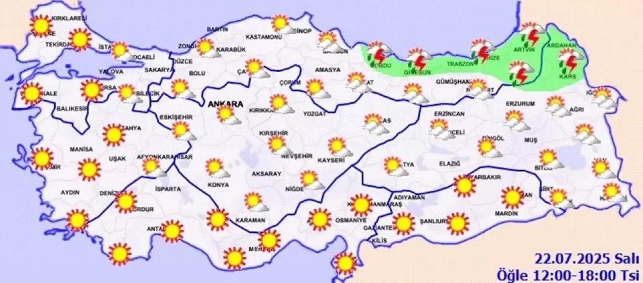Bugün ülkenin kuzeydoğu kesimlerinin parçalı yer yer çok bulutlu, Doğu Karadeniz kıyıları, Ordu, Artvin, Kars ve Ardahan çevreleri ile Erzurum'un kuzeydoğu kesimlerinin yerel olmak üzere sağanak ve gök gürültülü sağanak yağışlı, diğer yerlerin az bulutlu ve açık geçeceği tahmin ediliyor.