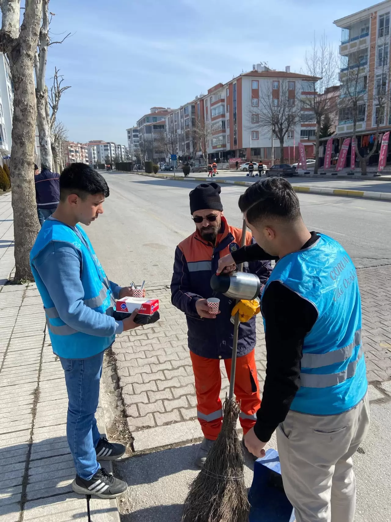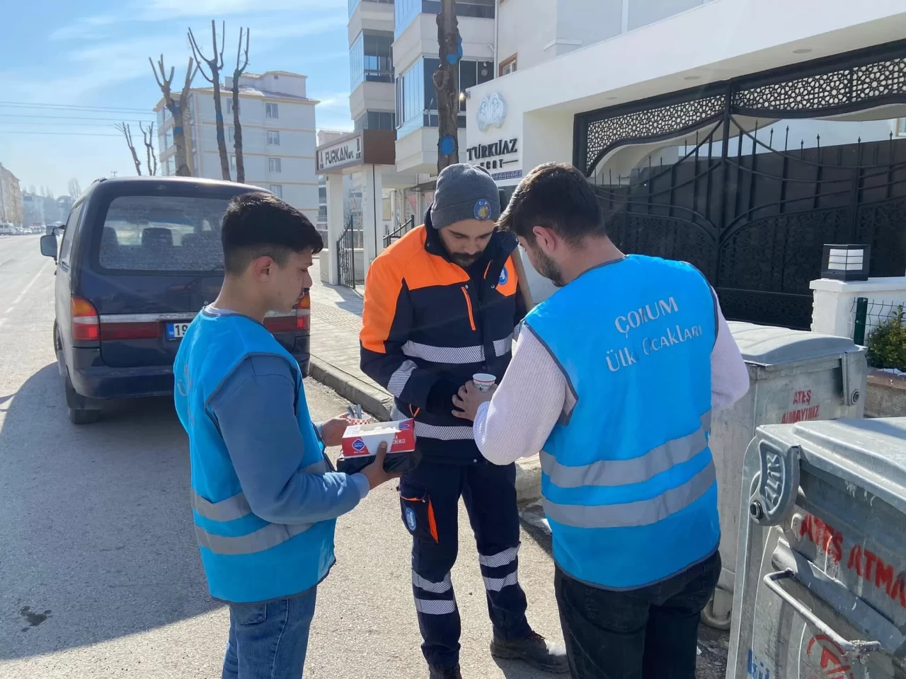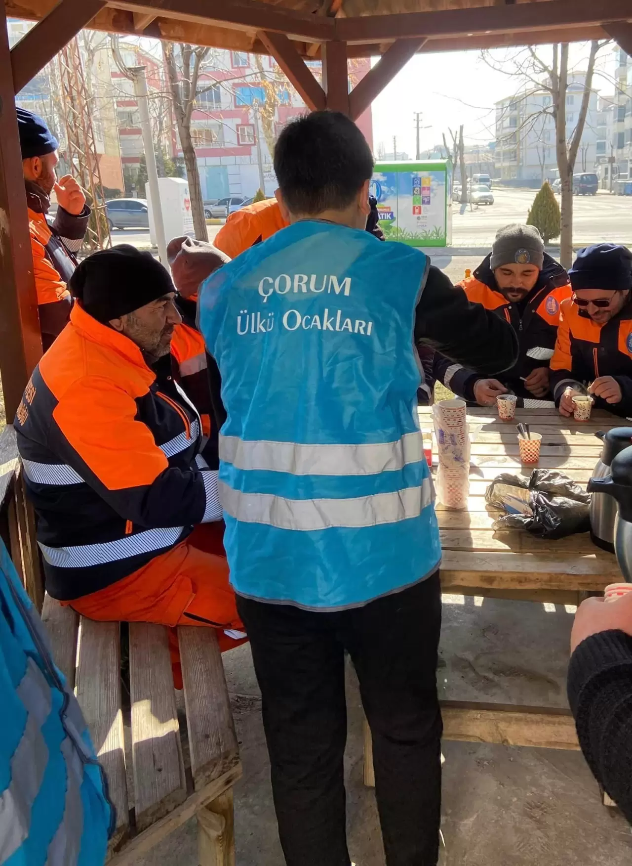 Çorum Ülkü Ocakları Ortaöğretim Birimi, kışın zorlu şartlarında çalışan temizlik görevlilerini ziyaret edip çay ikramında bulunarak emeklerine teşekkür etti.