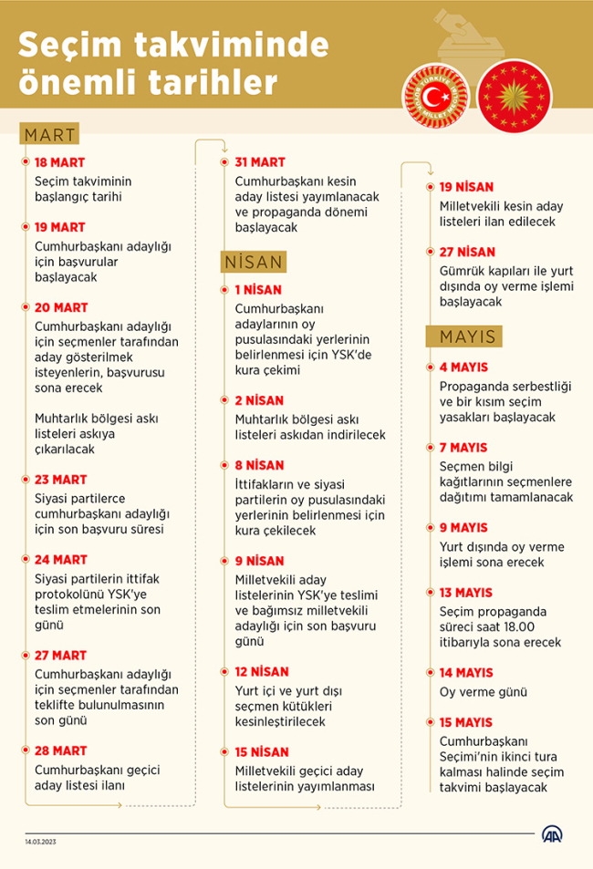 Yüksek Seçim Kurulu'nun (YSK) 14 Mayıs'ta yapılacak Cumhurbaşkanı Seçimi ve 28. Dönem Milletvekili Genel Seçimine yönelik takvimine göre, cumhurbaşkanı adaylığı için siyasi partilerce ve seçmenler tarafından aday gösterilmek isteyenlerin Kurula yapacakları adaylık başvuruları bugün başlayacak.
