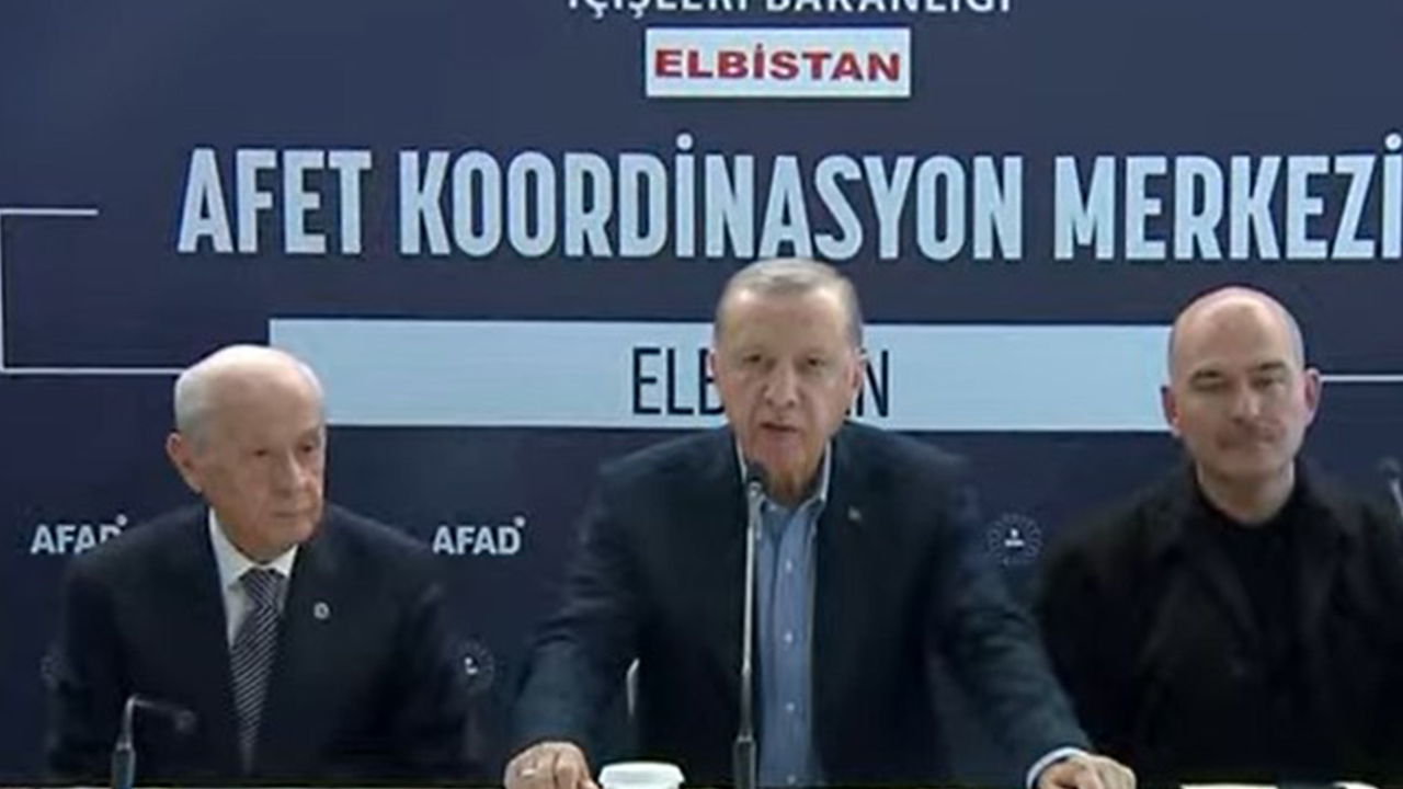 Cumhurbaşkanı Erdoğan, öğle saatlerinde Elbistan'da bulunan Kardeş Şehir Geçici Konaklama Merkezi'ne geldi. Burada, afetzedeleri ziyaret eden Cumhurbaşkanı Erdoğan'a Milliyetçi Hareket Partisi Genel Başkanı Devlet Bahçeli ve BBP Genel Başkanı Mustafa Destici de eşlik etti. Ziyaretin ardından liderler açıklamalarda bulundu.