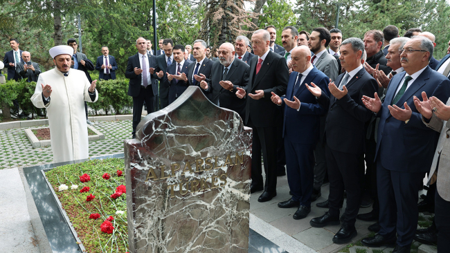Cumhurbaşkanı Recep Tayyip Erdoğan, Alparslan Türkeş'in oğlu, AK Parti Ankara Milletvekili Yıldırım Tuğrul Türkeş ile gittiği anıt mezarda dua okudu.