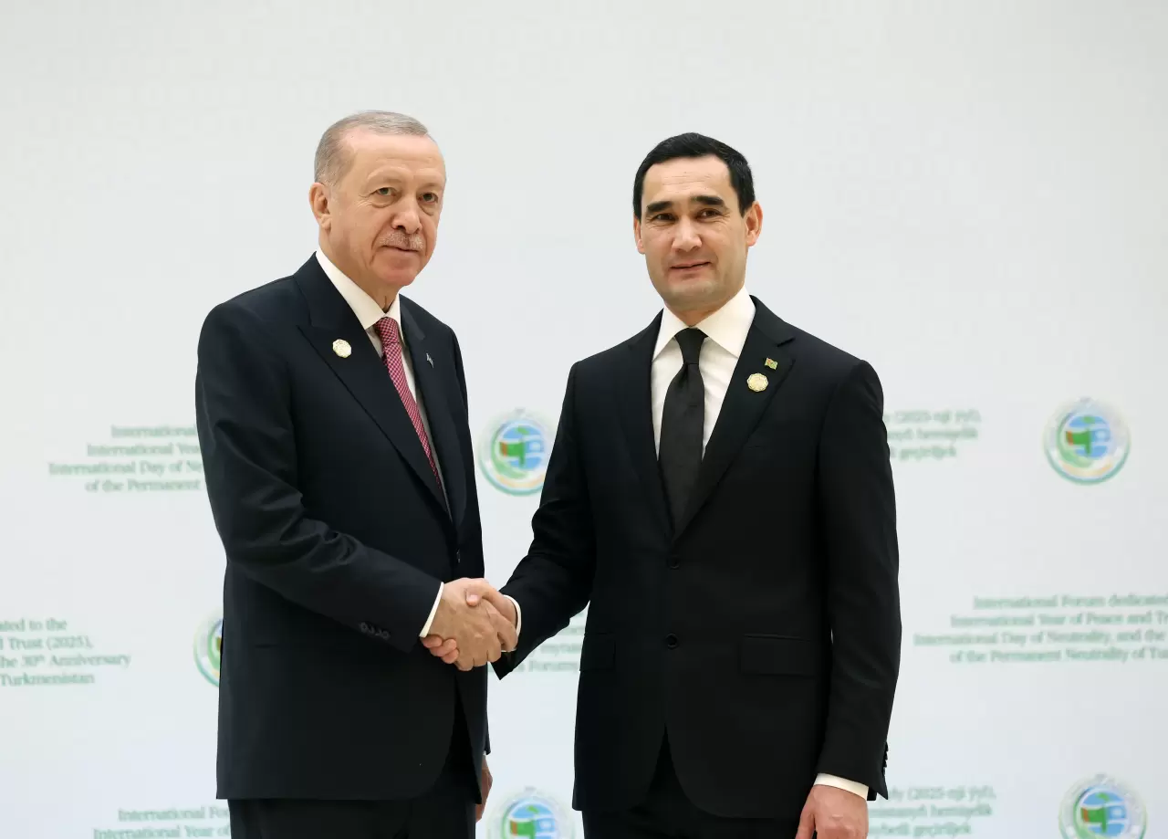 Ev sahibi Türkmenistan Cumhurbaşkanı Serdar Berdimuhamedov tarafından karşılanan Cumhurbaşkanı Erdoğan, Berdimuhamedov ile tokalaşarak fotoğraf çektirdi.