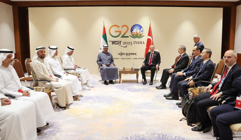 Cumhurbaşkanı Erdoğan, Bharat Mandapam Uluslararası Fuar ve Kongre Merkezi'nde "Tek Dünya" temasıyla gerçekleştirilen günün ilk oturumunun ardından BAE Devlet Başkanı Al Nahyan ile görüştü.