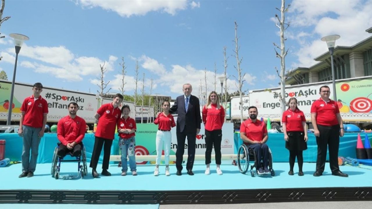 "Spor Aşkı Engel Tanımaz" diyerek Milli Eğitim Bakanlığına bağlı 81 ilde 500 özel eğitim okuluna farklı engel gruplarının kullanımına sunmak üzere üretilen 27 bin 259 adet spor malzemesinin yola çıkacağını söyleyen Erdoğan, içinde spor malzemelerinin olduğu tırları hep beraber ülkenin dört bir köşesine uğurlayacaklarını vurguladı.
