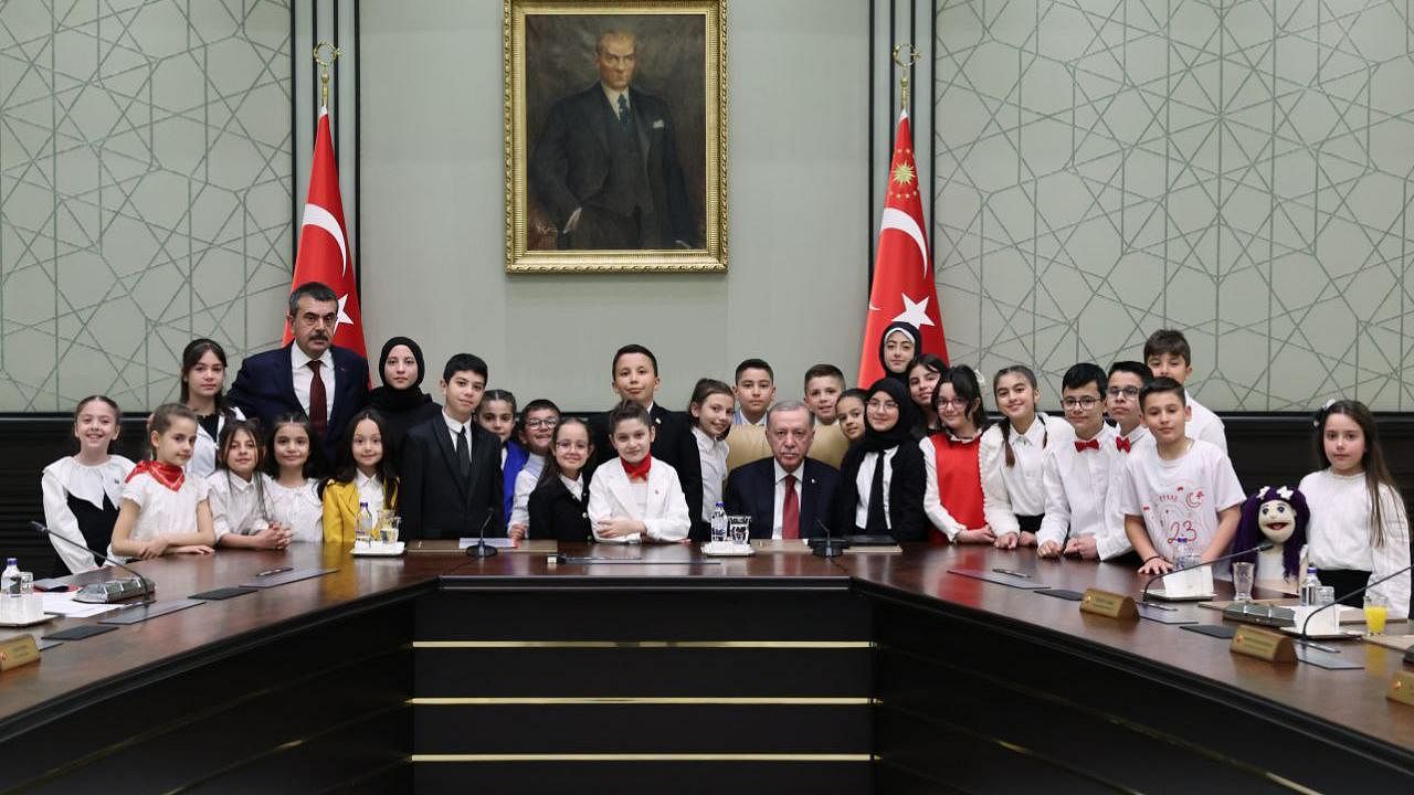 Gözümüzün nuru siz evlatlarımızın 23 Nisan Milli Egemenlik ve Çocuk Bayramı'nı tebrik ediyorum. Ülkemizdeki çocuklarla birlikte tüm dünya çocuklarının bayramını da sizleri Cumhurbaşkanlığı'nda misafir etmekten büyük memnuniyet duyuyorum. Bu vesileyle tüm dünya çocuklarına sizlerin aracılığıyla en kalbi sevgilerimi gönderiyorum.