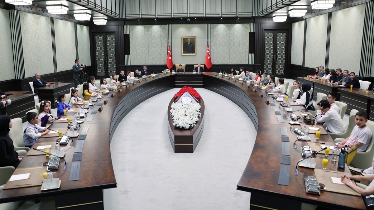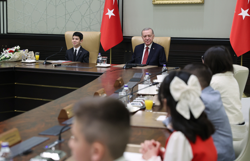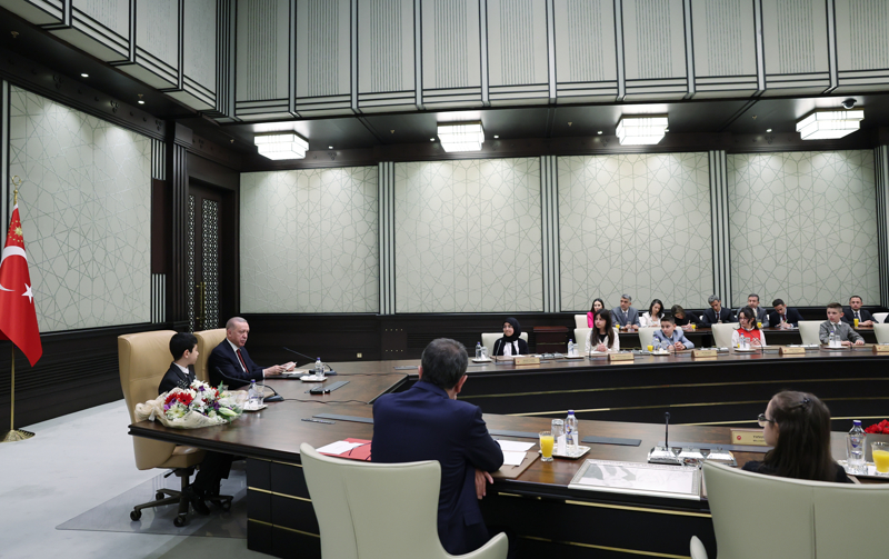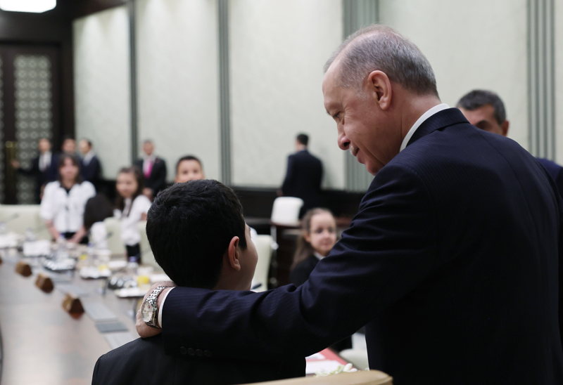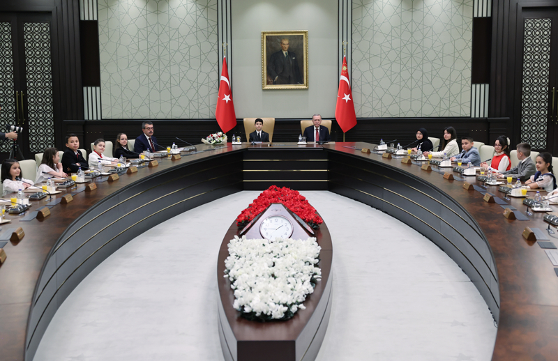 Cumhurbaşkanı Erdoğan, 23 Nisan Ulusal Egemenlik ve Çocuk Bayramı dolayısıyla Cumhurbaşkanlığı Külliyesi'nde kabine toplantısının yapıldığı salonda Bakan Tekin ve beraberindeki çocukları kabul etti.