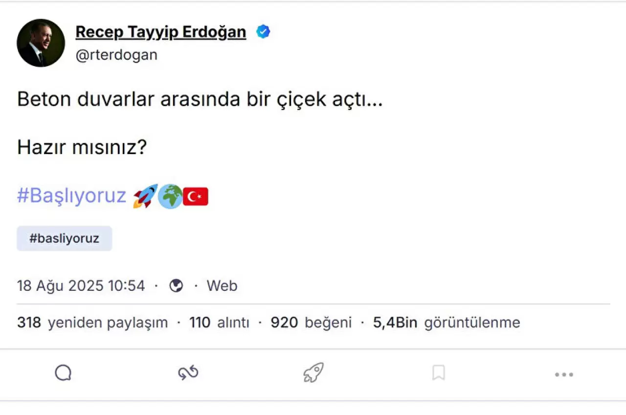 Erdoğan'ın "Başlıyoruz" etiketli paylaşımında, Türk bayrağı, dünya ve roket emojileri de yer aldı.