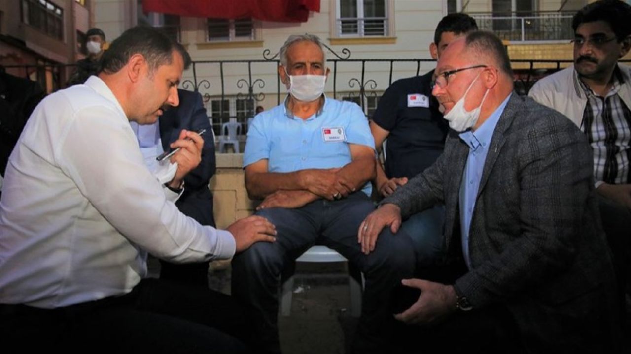 Ayhan ve beraberindekiler, şehidin babaevi önünde kurulan taziye çadırında aileye başsağlığı dileklerini iletti.