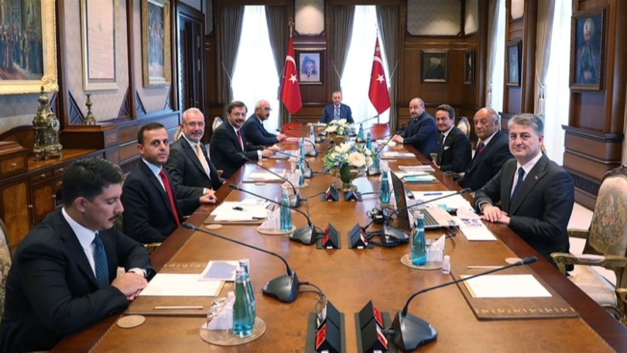 Cumhurbaşkanlığı Külliyesi'nde basına kapalı gerçekleştirilen kabulde, TOGG Yönetim Kurulu üyeleri Rifat Hisarcıklıoğlu, Tuncay Özilhan, Bülent Aksu, Ahmet Nazif Zorlu, Fuat Tosyalı ile TOGG Üst Yöneticisi Gürcan Karakaş yer aldı.