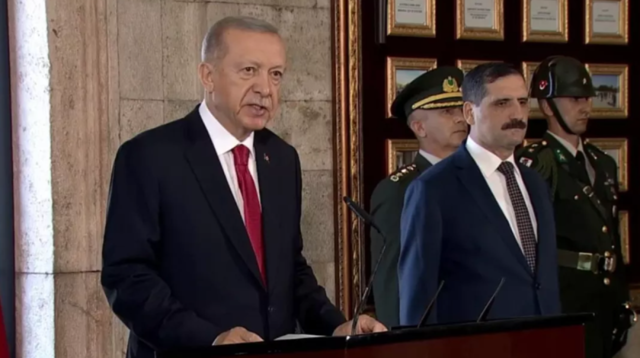 Erdoğan başkanlığındaki heyet, mozoleye çıkan merdivenin önünde fotoğraf çektirdikten sonra Misak-ı Milli Kulesi'ne geçti. Burada Anıtkabir Özel Defteri'ni imzalayan Cumhurbaşkanı Erdoğan, deftere şunları yazdı:
