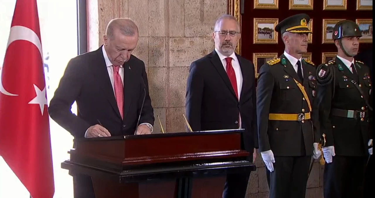 Saygı duruşu ve İstiklal Marşı'nın okunmasının ardından Cumhurbaşkanı Erdoğan, Anıtkabir Özel Defteri'ni imzaladı.