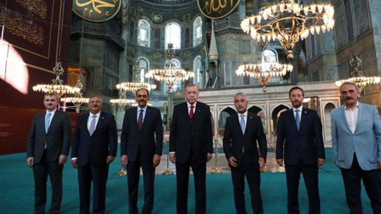 Erdoğan, eşi Emine Erdoğan ve MHP Genel Başkanı Devlet Bahçeli akşam saatlerinde yarın cuma namazı ile ibadete açılacak olan Ayasofya'ya geldi.