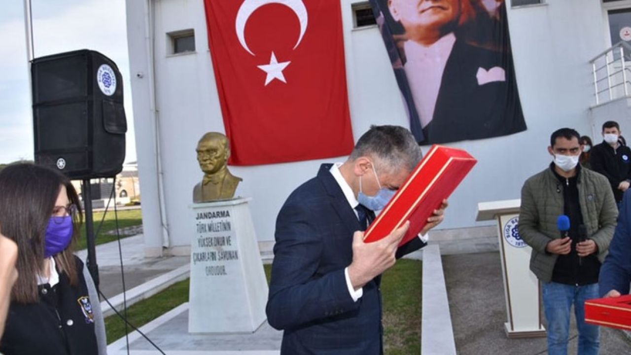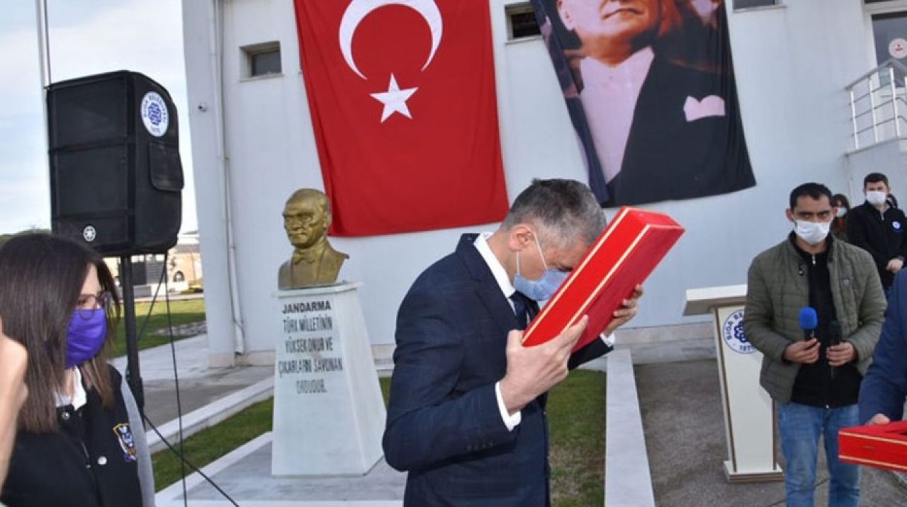 AA - 18 Mart Şehitleri Anma Günü ve Çanakkale Deniz Zaferi’nin 106’ncı yıl dönümü etkinlikleri kapsamında Çanakkale-Ankara 24. Zafer Koşusu’nda yer alan Çanakkaleli sporcuların getirdiği emanetlerin teslimi için Denizkent Jandarma Karakol Komutanlığında tören yapıldı.
