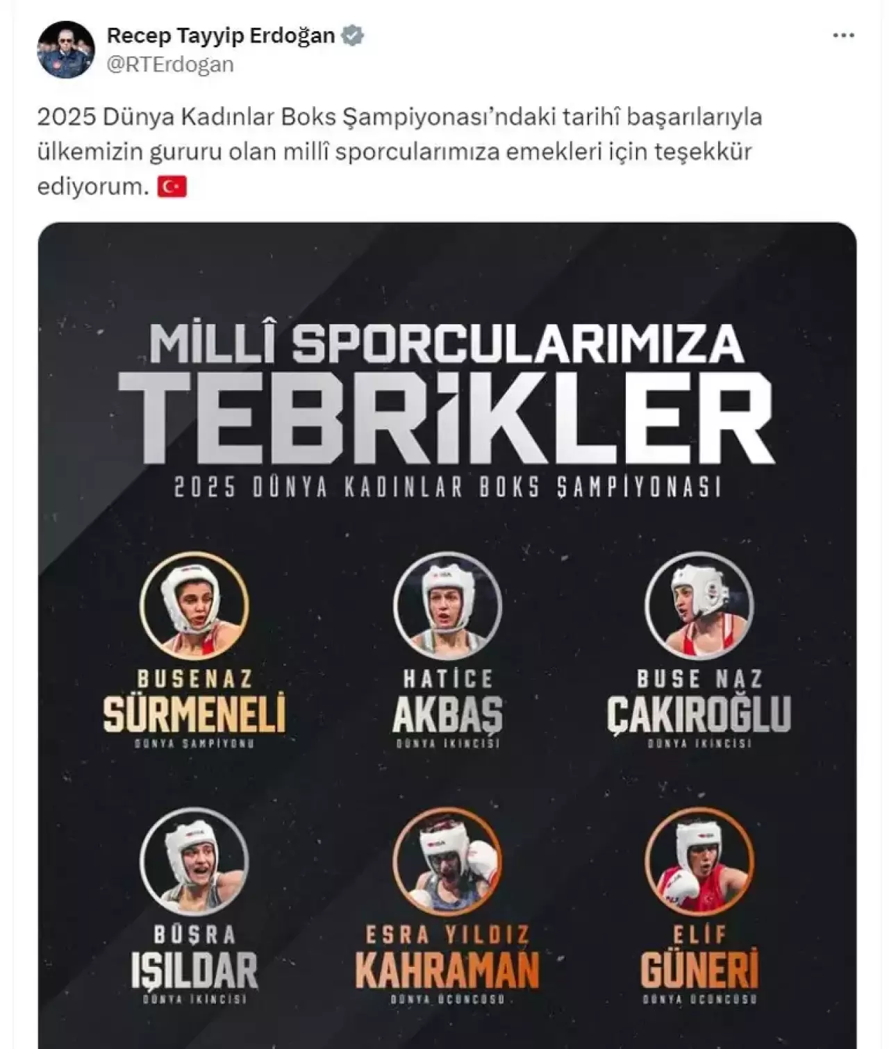 Cumhurbaşkanı Recep Tayyip Erdoğan, sosyal medya hesabından, dünya şampiyonu Busenaz Sürmeneli, dünya ikincileri Hatice Akbaş, Buse Naz Çakıroğlu ve Büşra Işıldar ile dünya üçüncüleri Esra Yıldız Kahraman ve Elif Güneri'nin fotoğraflarını paylaşarak, "2025 Dünya Kadınlar Boks Şampiyonası’ndaki tarihi başarılarıyla ülkemizin gururu olan milli sporcularımıza emekleri için teşekkür ediyorum" ifadelerini kullandı.