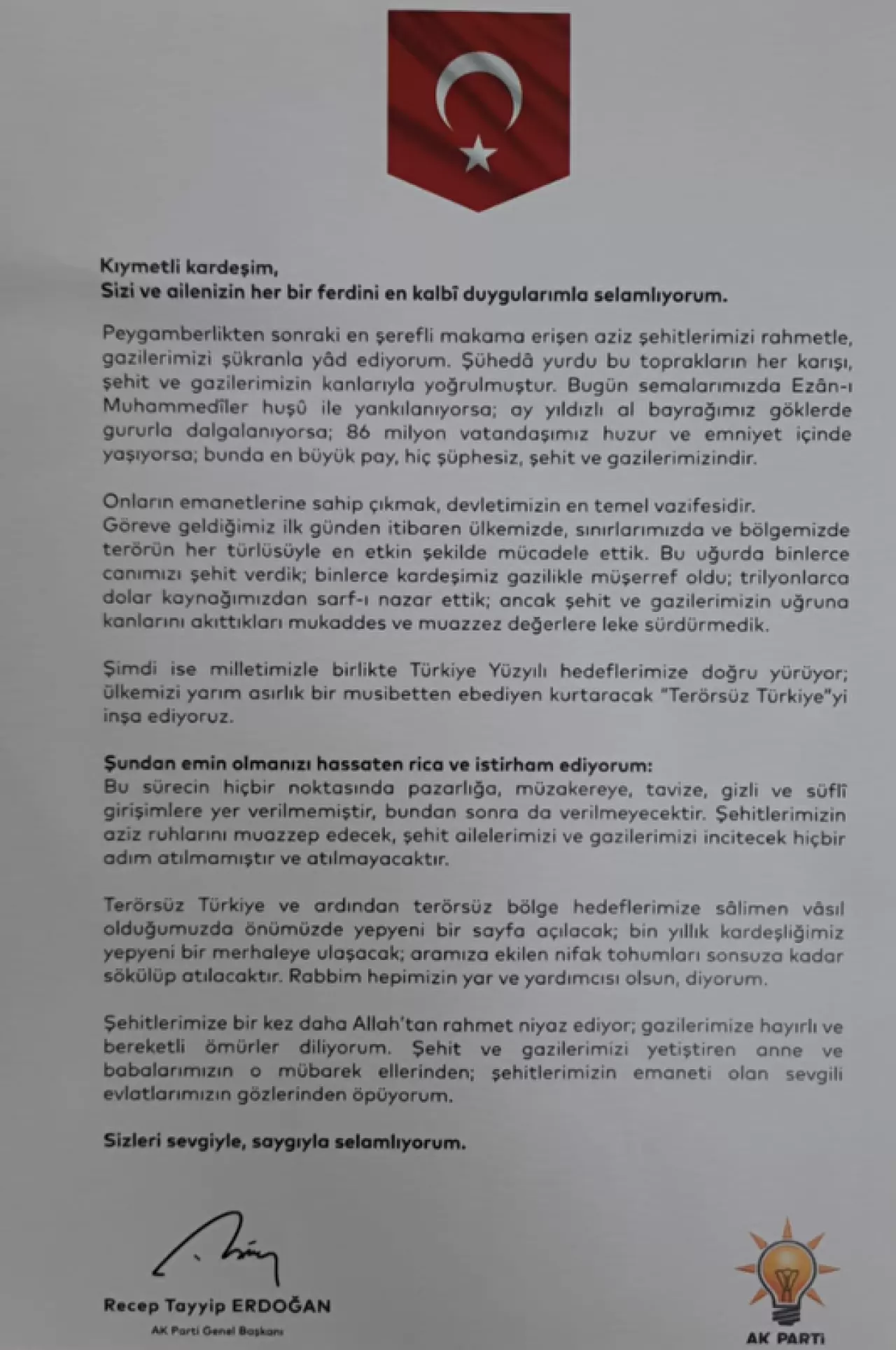 Cumhurbaşkanı Recep Tayyip Erdoğan, şehit ve gazi yakınlarına hitaben duygusal bir mektup kaleme aldı. Mektubunda, Türkiye’nin terörle mücadelesine ve “Terörsüz Türkiye” hedefi doğrultusundaki kararlılığına vurgu yapan Erdoğan, şehit ailelerine ve gazilere minnetini ifade etti.