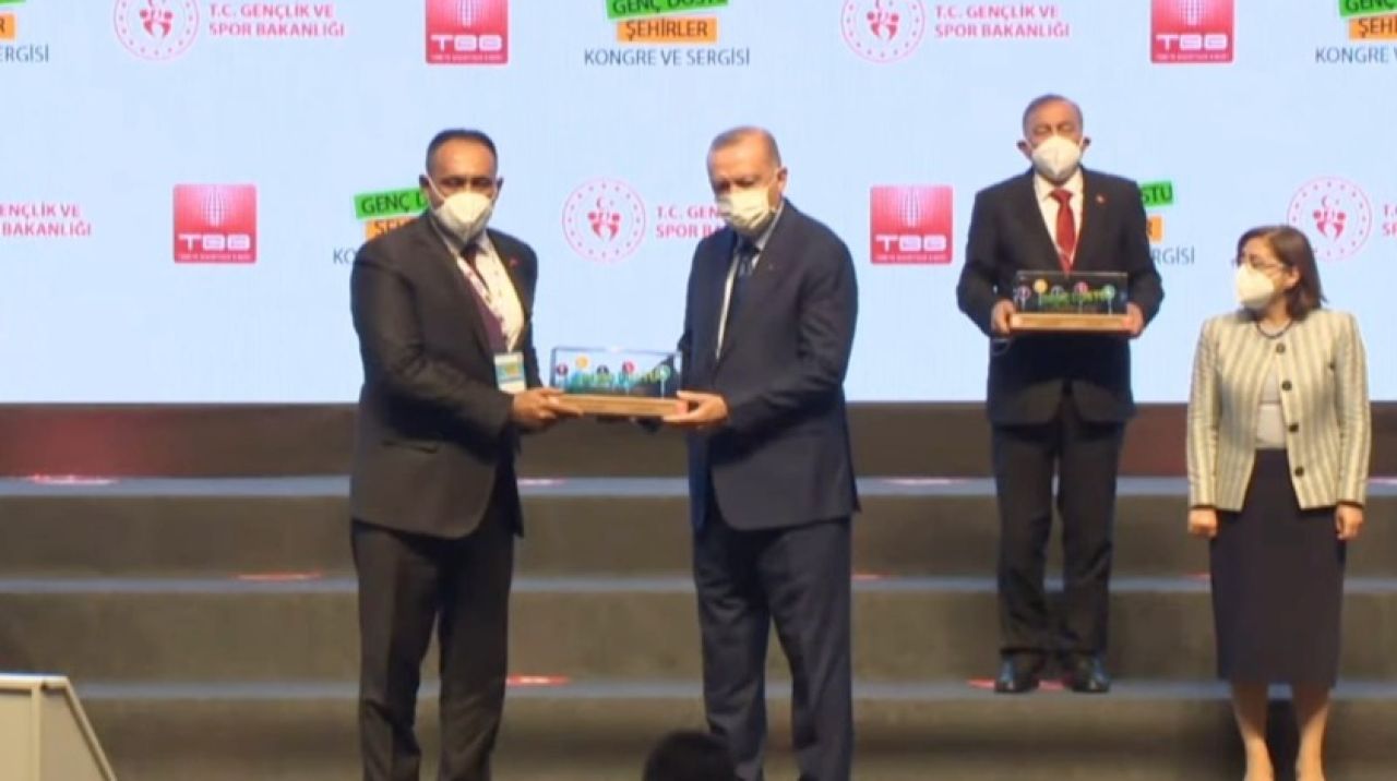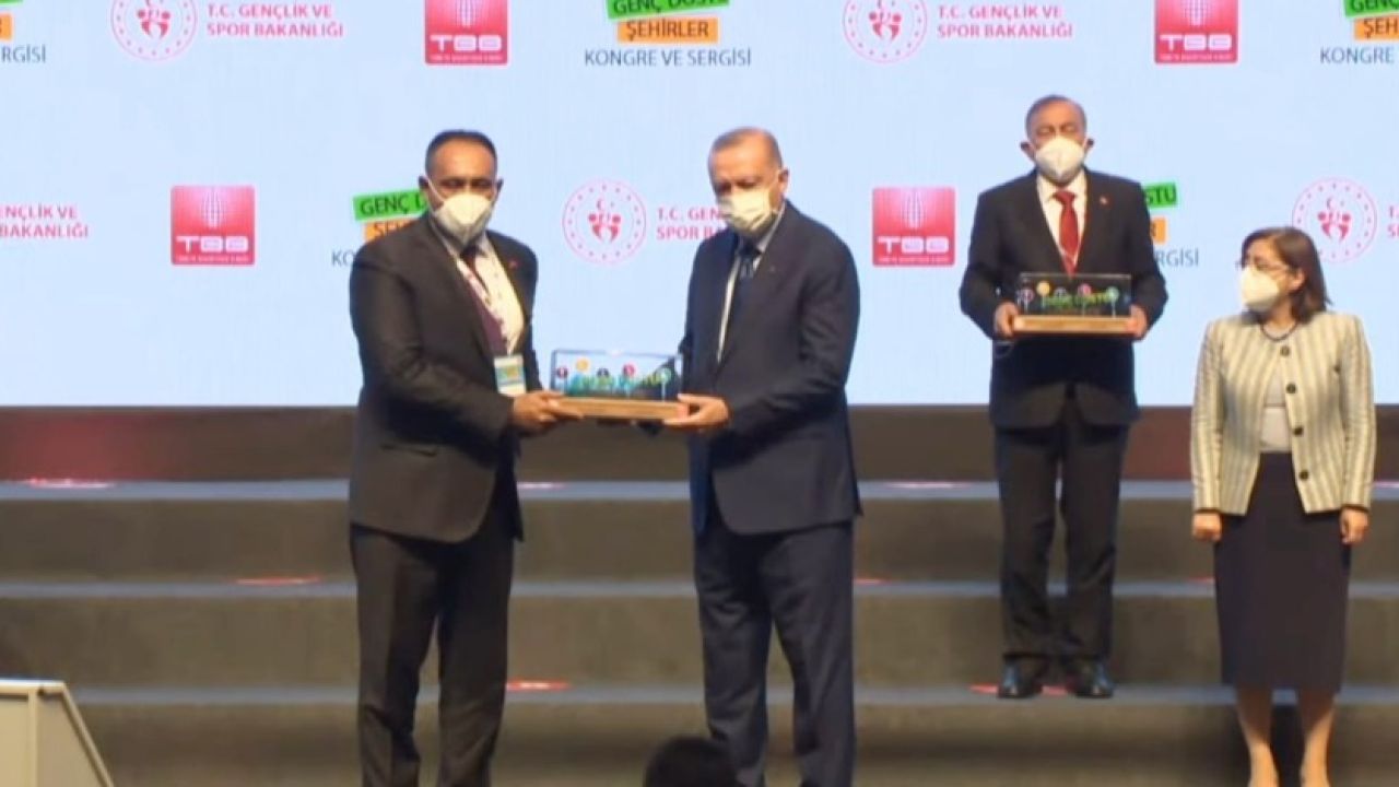 Toroslar Belediye Başkanı Atsız Afşın Yılmaz, ödülü Cumhurbaşkanı Recep Tayyip Erdoğan'ın elinden aldı.